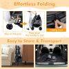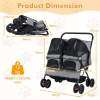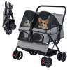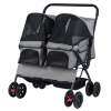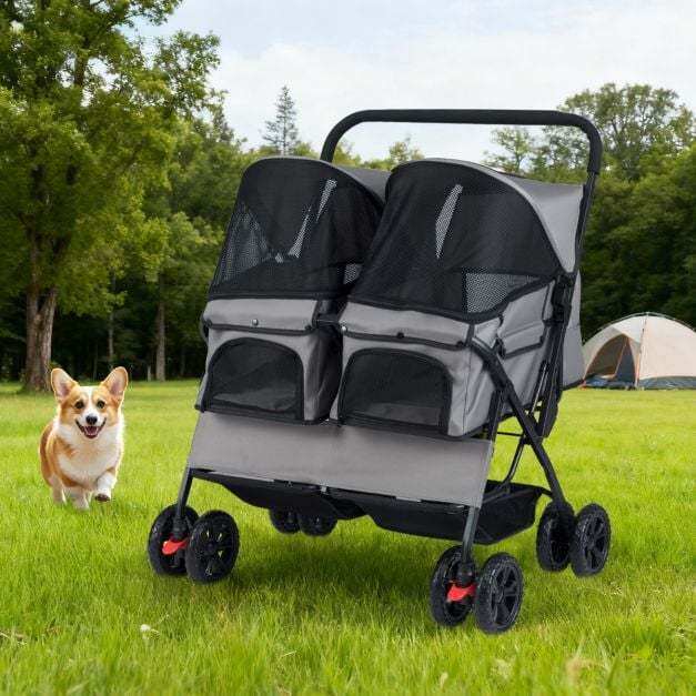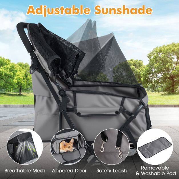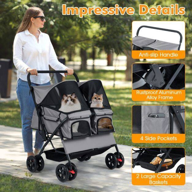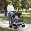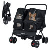 ● Easy Maneuverability: The twin dog stroller ensures smooth handling with shock-absorbing front wheels that swivel or lock for directional maneuvering. Also, the rear wheels are equipped with brakes for extra stability. Plus, the non-slip handle makes it easy to navigate parks, sidewalks, or shopping centers.