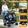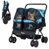 ● Easy Maneuverability: The twin dog stroller ensures smooth handling with shock-absorbing front wheels that swivel or lock for directional maneuvering. Also, the rear wheels are equipped with brakes for extra stability. Plus, the non-slip handle makes it easy to navigate parks, sidewalks, or shopping centers.
