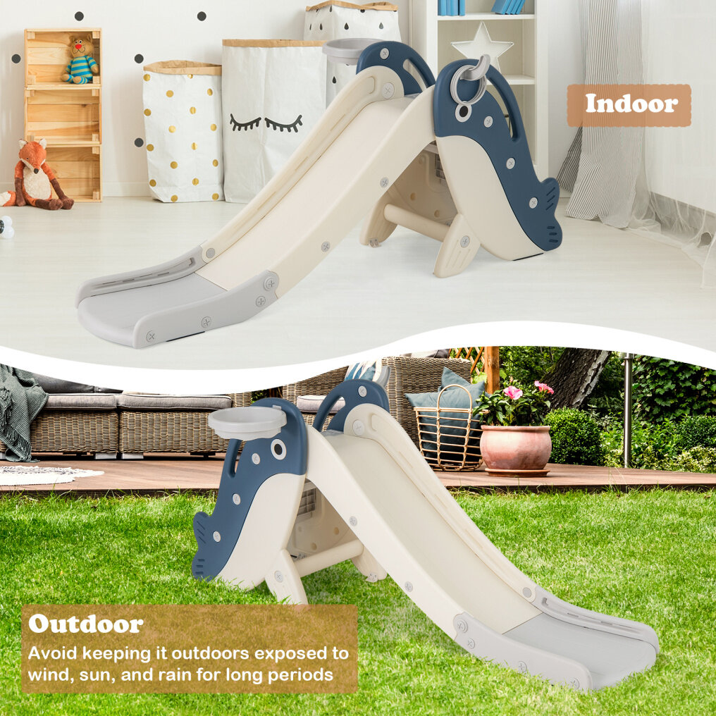 ● 4 in 1 Versatile Slide Playset: This toddler slide seamlessly integrates sliding, climbing, shooting, and ringing games, helping kids develop essential motor skills and coordination. With the included basketball, inflator, and rings, your child can enjoy non-stop fun in a multitude of activities.