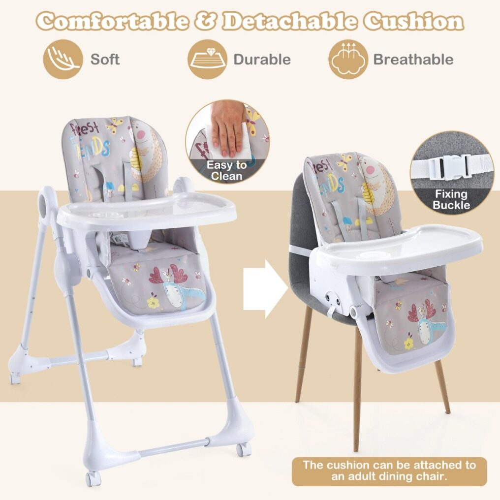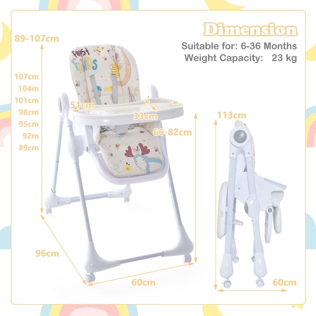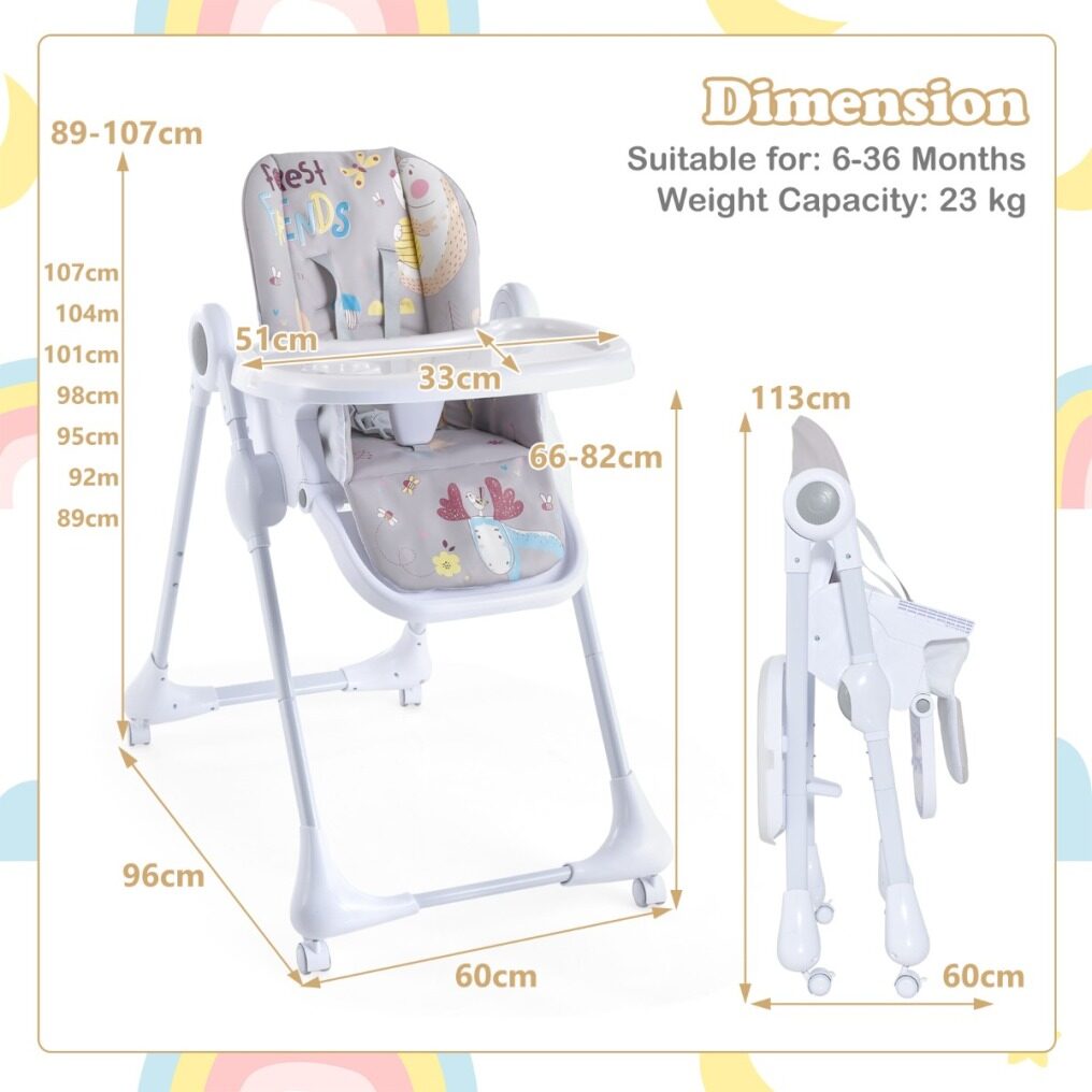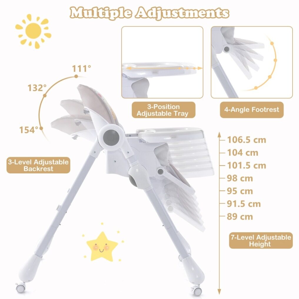 Adjustable Baby High Chair: Our baby high chair features a 3-position backrest, 3-position tray and 5-setting footrest, which will meet babies' needs of different growing stages. Besides, 7-level adjustable height allows it to grow with your little one.