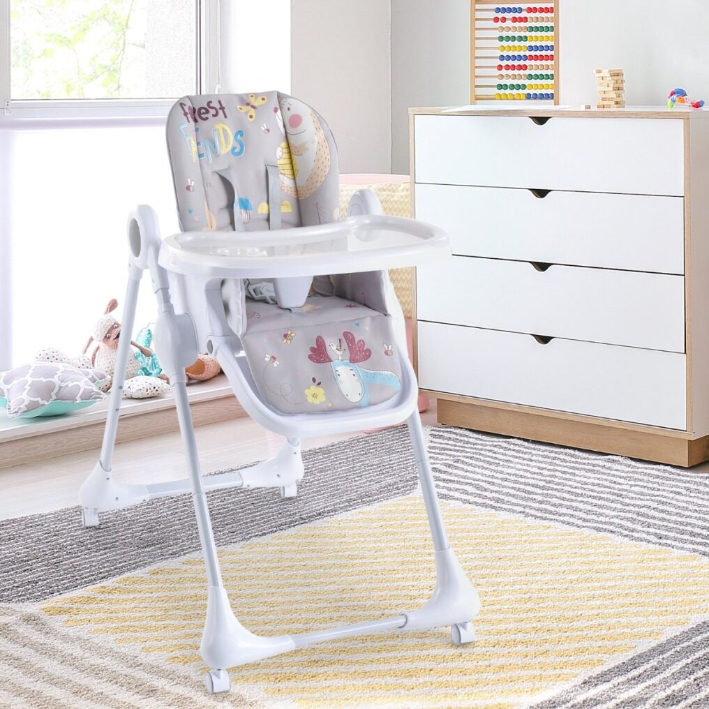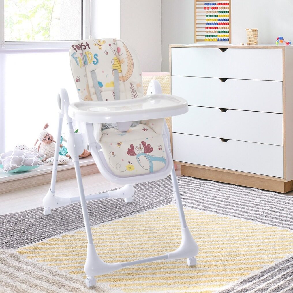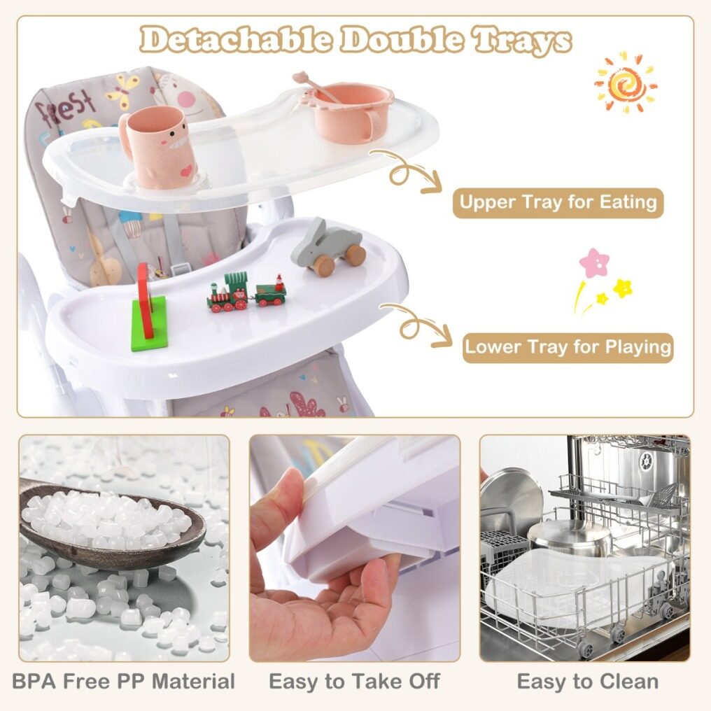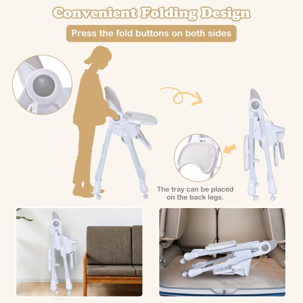 Are you looking for a functional feeding chair for infants? Do not miss our adjustable baby high chair. Its backrest reclines in 3 positions and the footrest can be adjusted in 5 levels to help you to find the most suitable position for your baby. To satisfy needs of fast growing babies, we design it with 7-position adjustable height. Plus, it comes with 1 removable double-layer tray, which has 3 adjustable lengths. 4 wheels with locks also allow parents to move it effortlessly. Tips: The wheels can be removed. After use, you can press the folding buttons to fold it into a small size for easy storage.