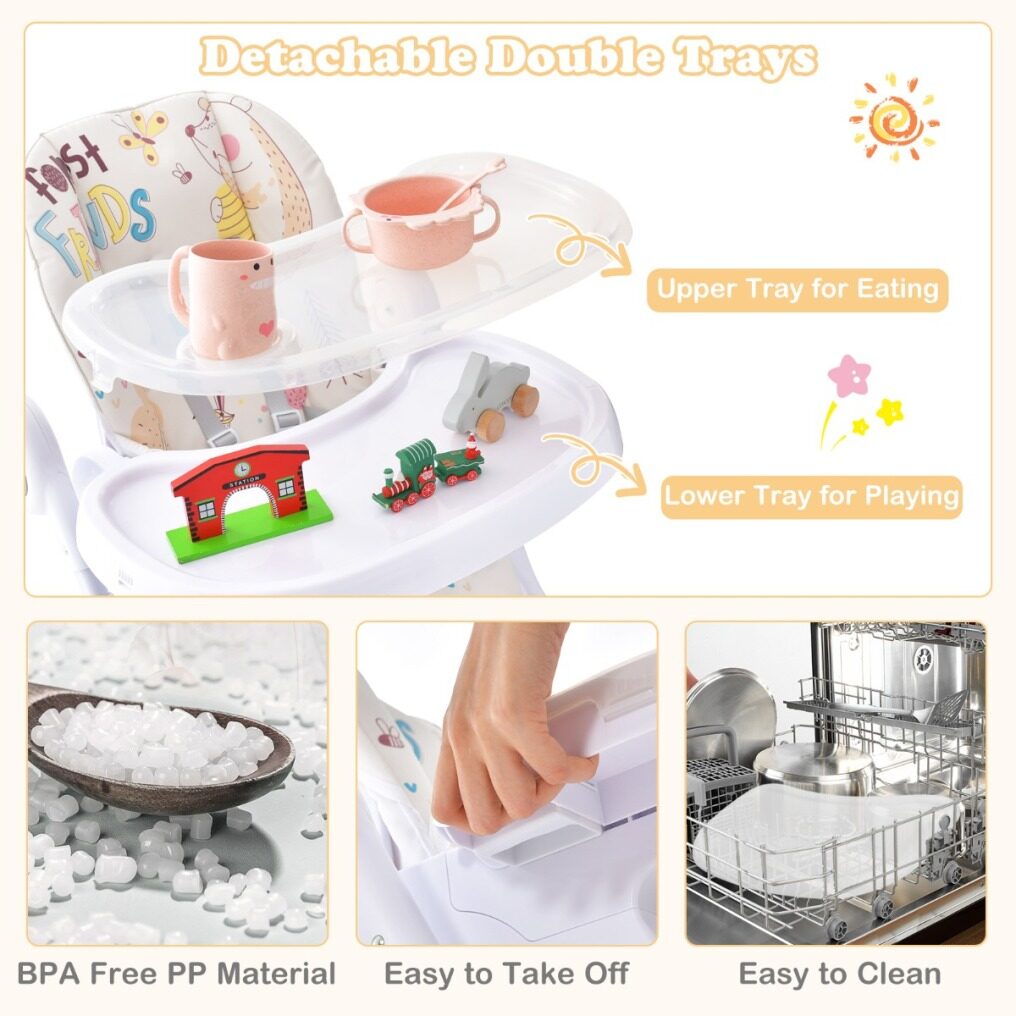 Detachable Tray & Cushion: We also equip it with a detachable double-layer tray: the top layer for eating, while the bottom layer for playing. It is food-grade, BPA-free and dishwasher-safe. When not in use, the tray can be fixed on the frame. Meanwhile, the removable PU leather seat cushion is smooth, wear-resistant and washable.