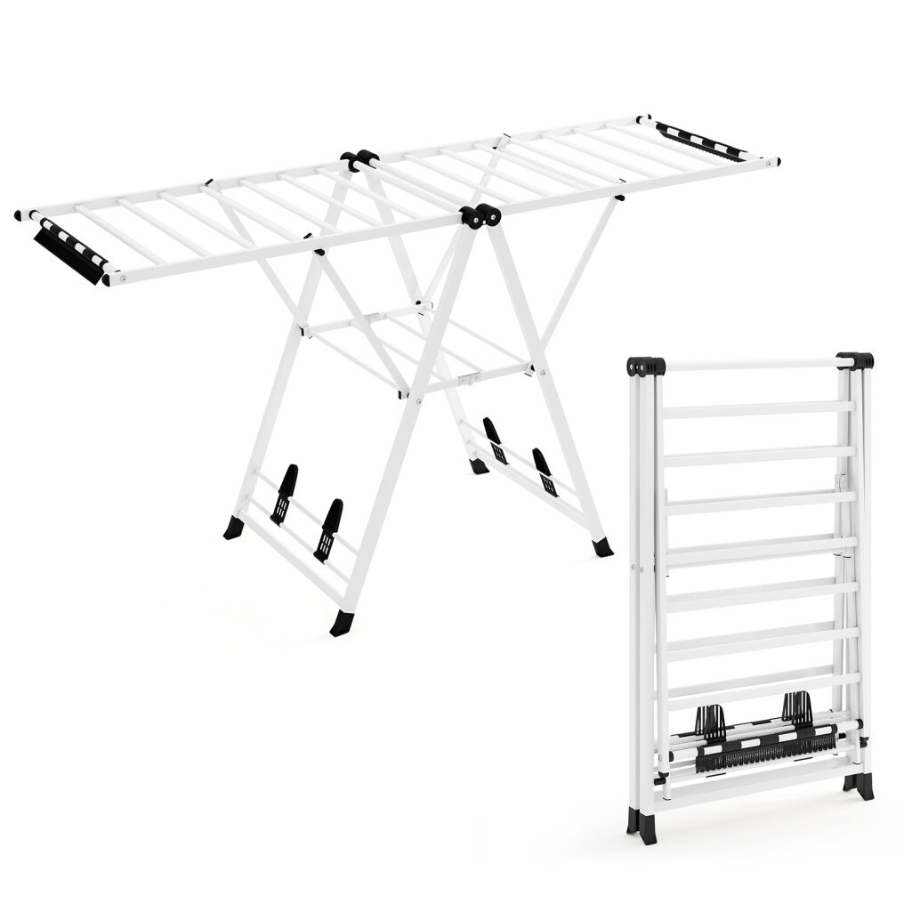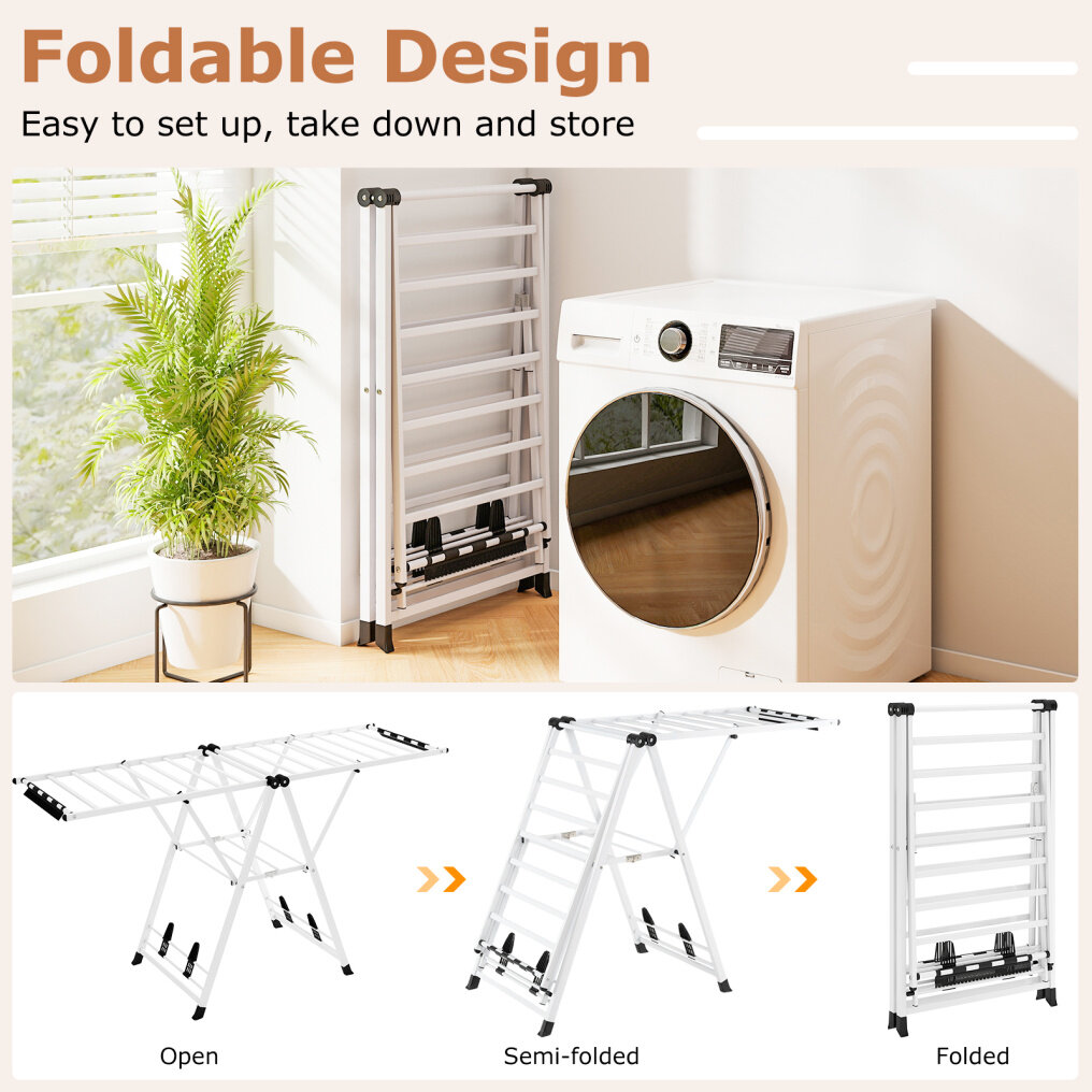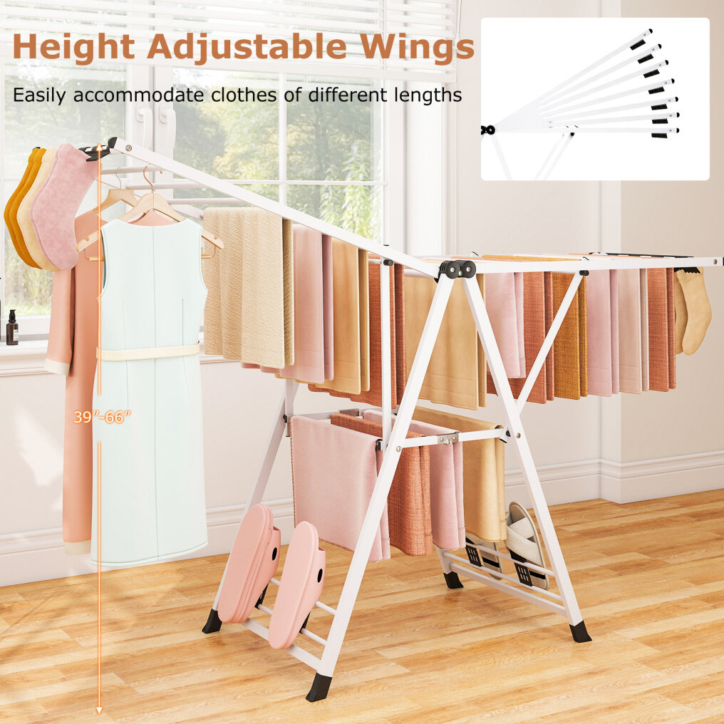 This clothes drying rack boasts spacious drying space, including drying rails, sock clips, and shoe racks, which can manage multiple loads of laundry at once. Moreover, the laundry hanger has height-adjustable wings to dry both small garments and large linens. The thoughtful spacing between the rails also promotes adequate air flow. Built with a strong metal structure and reinforced with A-shaped frame, the clothes drying rack combines stability with durability. Maximize your space with this foldable drying rack that tucks away easily when not in use.