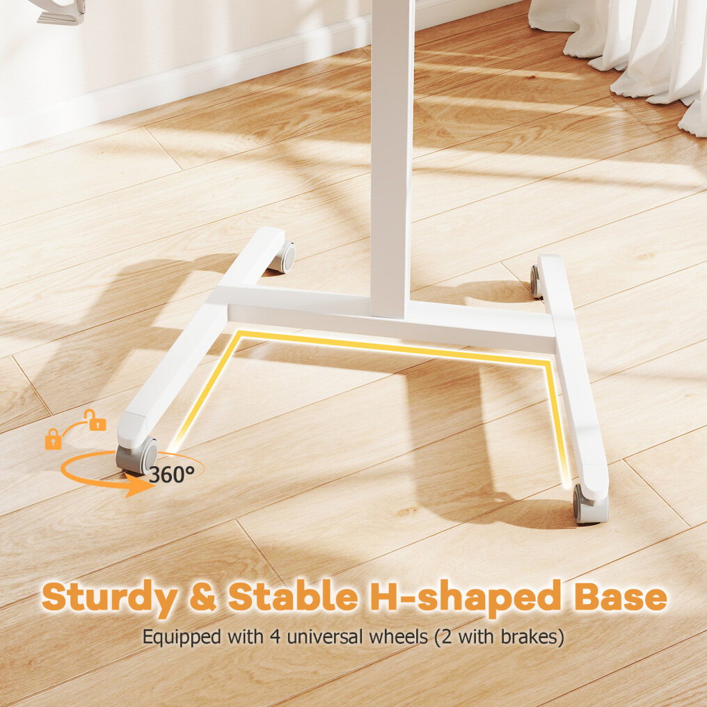 The tiltable tabletop allows you to work comfortably at different angles, making it perfect for drawing, reading, or writing. The height-adjustable design ensures that you can customize the desk to your preferred level. Equipped with 4 universal wheels (2 with brakes), this laptop desk can easily be moved around your home or office. Its foldable design optimizes space and allows effortless storage when not in use. Stay organized and efficient with the handy hook for hanging your essentials and cup holder to keep your beverages within reach. Built on a stable H-shaped metal base, the portable workstation promises durability and robust support.