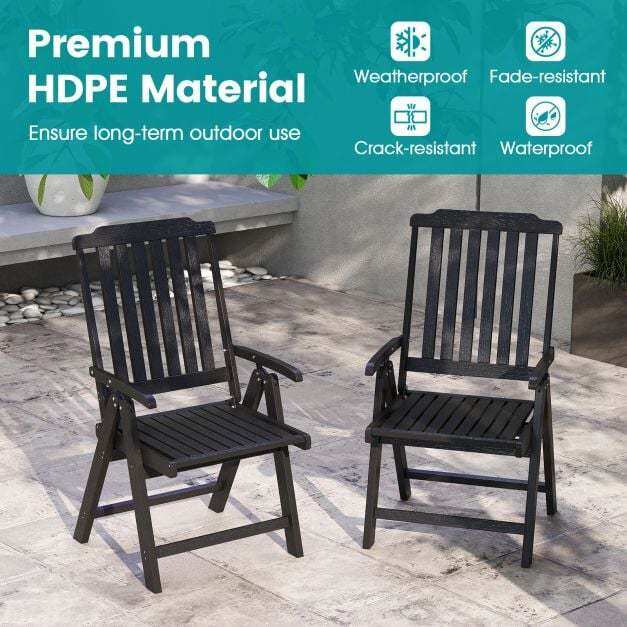 Low Maintenance: The all-weather HDPE dining chair features a slatted design that prevents water accumulation and is easy to clean with a wipe cloth. In extreme weather conditions such as strong winds, heavy rain, or snow, please fold the chairs to extend its lifespan.