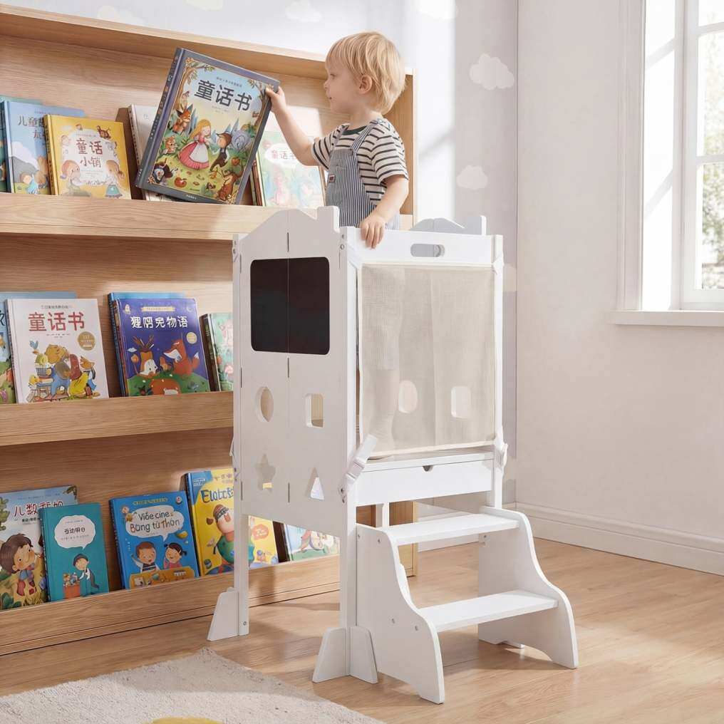 ● Reliable and Sturdy Structure: The foldable step stool is crafted from wooden materials for great strength and long-lasting use. Supported by anti-tip feet, the freestanding tower remains steady and stable on the ground.