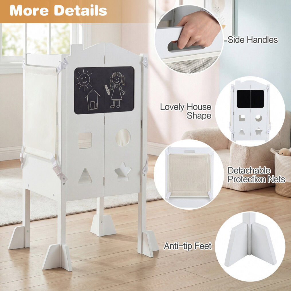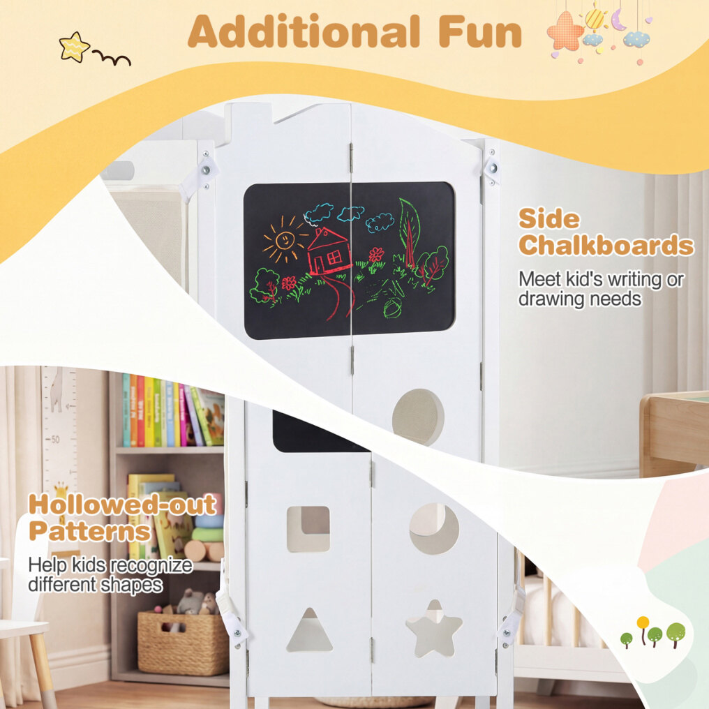 ● Chalkboards and Lovely Patterns: The small chalkboards on both sides meet kid's writing or drawing needs, which is great for kid's creativity, imagination, and motor skills. Moreover, the hollowed-out patterns help kids recognize different shapes and create a playful look.