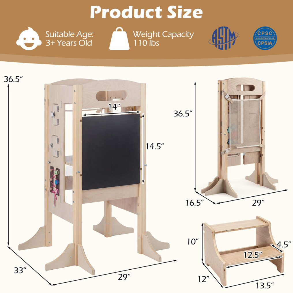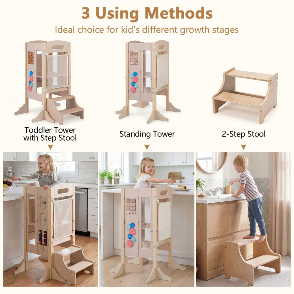 ● 3 Using Methods for Your Child: The wooden kitchen step stool serves well as a standing tower, toddler tower with step stool, or 2-step stool. The kids helper is the perfect companion for family cooking, crafts, and daily routines, which will be an ideal choice for kid's different growth stages.