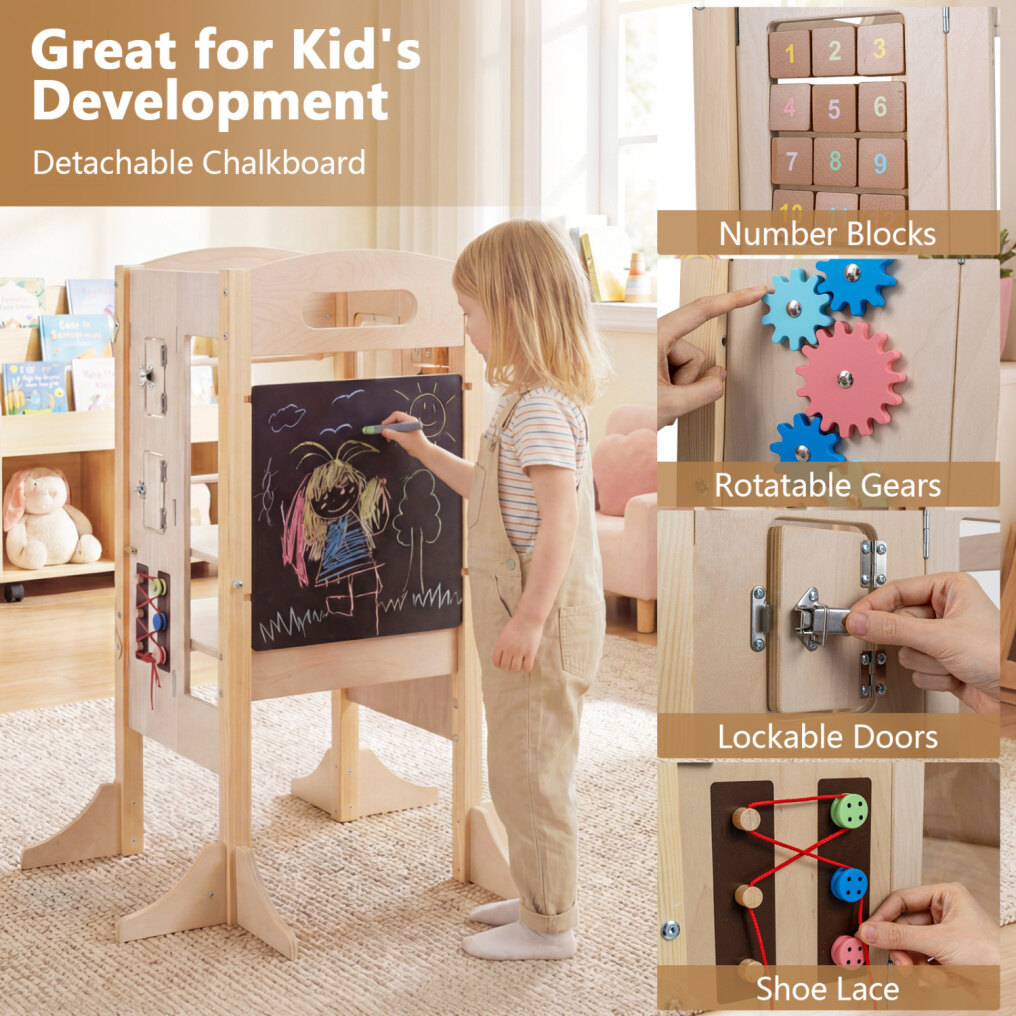 ● Chalkboard & Montessori Games: Detachable chalkboard ensures creative drawing. Number blocks, rotatable gears, lockable doors, and shoe lace are included to inspire creativity and learning through play, encouraging your child's imagination and skill development during interactive activities.