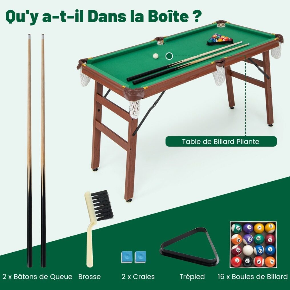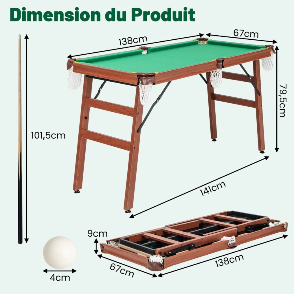 Are you tired of dealing with bulky and space-consuming pool tables? Look no further! The pool game table features an easy folding design that allows you to fold and store it in a compact size, saving valuable room space. Whether it's a party activity, a family interaction, or a relaxation break in the office, this multifunctional billiard pool table is suitable for various occasions. Crafted with a sturdy and durable frame, including reinforced crossbars for extra stability, it ensures a reliable and enjoyable playing experience. With adjustable foot levelers, sturdy ball nets, and leather protected corners, this pool table showcases exquisite details. Plus, it comes with everything you need to start playing, including cue sticks, chalks, a brush, billiard balls, and a triangle. Upgrade your game and bring the fun to any space with our easy folding pool game table!