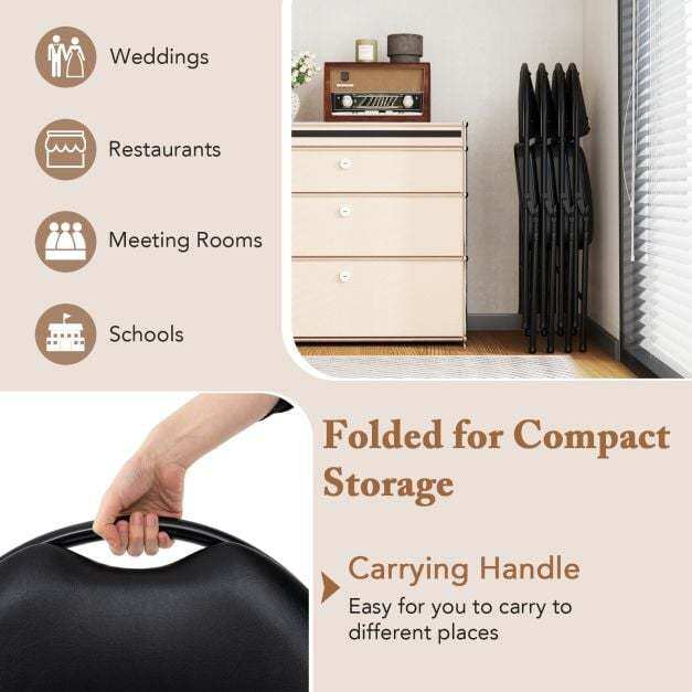 Optimal Comfort: Each folding chair boasts a 109° reclined backrest, designed to perfectly contour your back. Moreover, these chairs are crafted with skin-friendly PVC leather upholstery and cushioned with elastic sponge for great comfort in every seating moment.