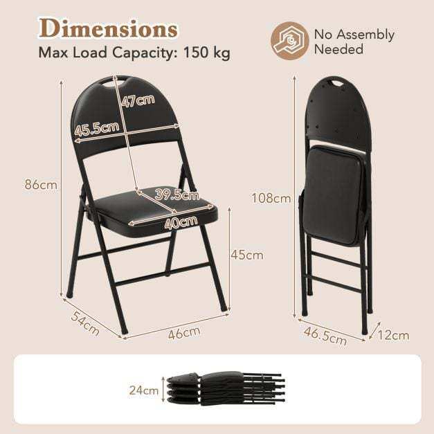Reinforced with a sturdy metal frame, each folding chair is able to hold up to 150kg. In addition, these chairs feature foot pad protection for your floors. When not in use, they conveniently fold down to a compact size for storage. Their modern design fits seamlessly into any space, while their versatility and portability make them ideal for weddings, restaurants, meetings, and more. No assembly is needed, and a handy carrying handle ensures effortless transportation.
