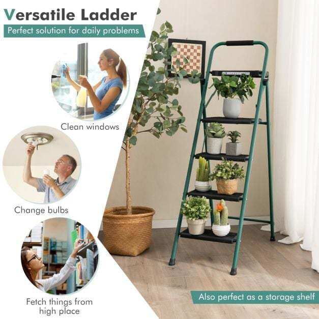 Versatile Ladder: This 4-step folding ladder with functional tool tray will be a perfect solution for daily problems. It will help you a lot if you want to clean windows, change bulbs or fetch things from high place. The ladder is also ideal to be used as a storage shelf.
