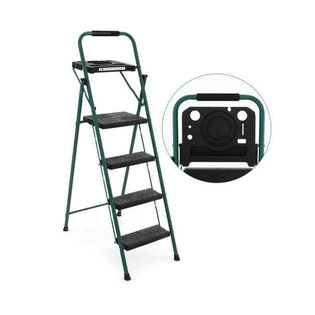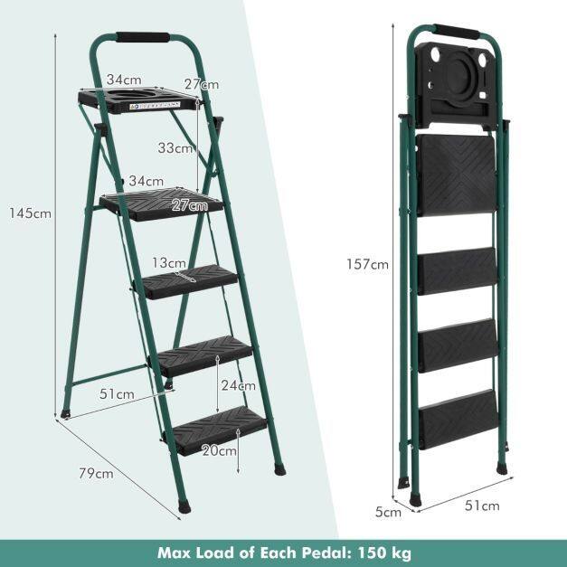 Functional Tool Tray: This 4-step ladder is designed with a convenient tool tray for fetching tools easily. Such a unique design highly improves your working efficiency. Note: weight capacity of tool tray is only 5kg, please do not step on it.