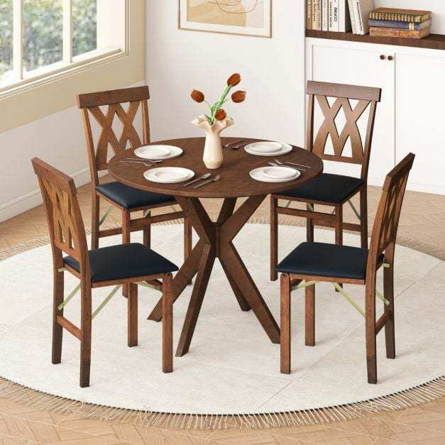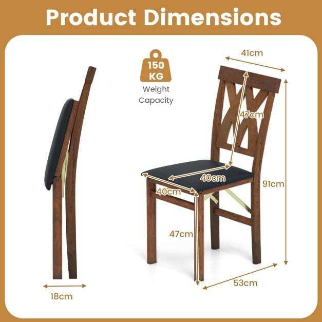 This wooden dining chair set measures 41 x 53 x 91 cm (L x W x H), which showcases a sleek and space-saving design that folds flat quickly, making it perfect for small spaces or temporary setups. Crafted from robust rubber wood, the chairs offer a solid structure that ensures stability and longevity, even with daily use. Upholstered in high-quality PVC leather, these chairs not only add a touch of sophistication to your decoration but are also waterproof, stain-resistant, and incredibly easy to clean. The padded seats and curved backrests provide supreme comfort, making these chairs ideal for long periods of sitting, whether it’s for dining, working, or relaxing. Featuring a versatile aesthetic, this set seamlessly adapts to various indoor settings, from modern kitchen spaces to casual office environments.