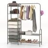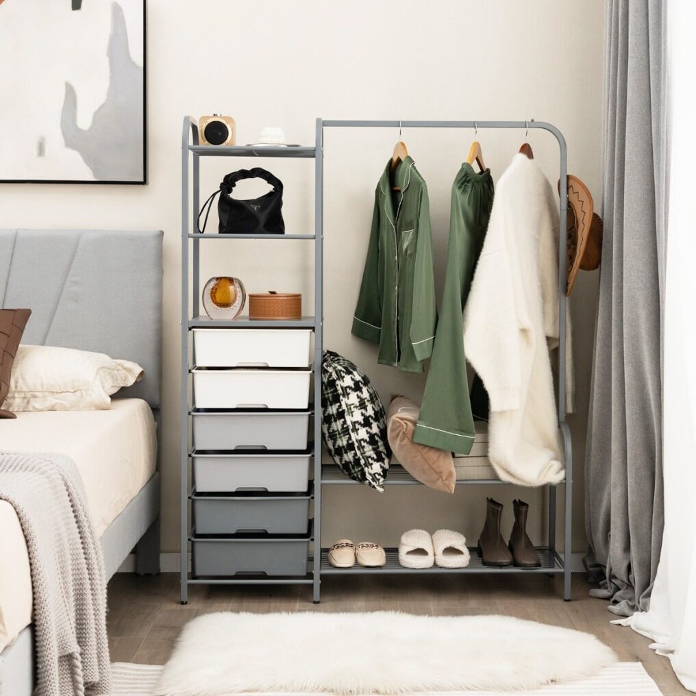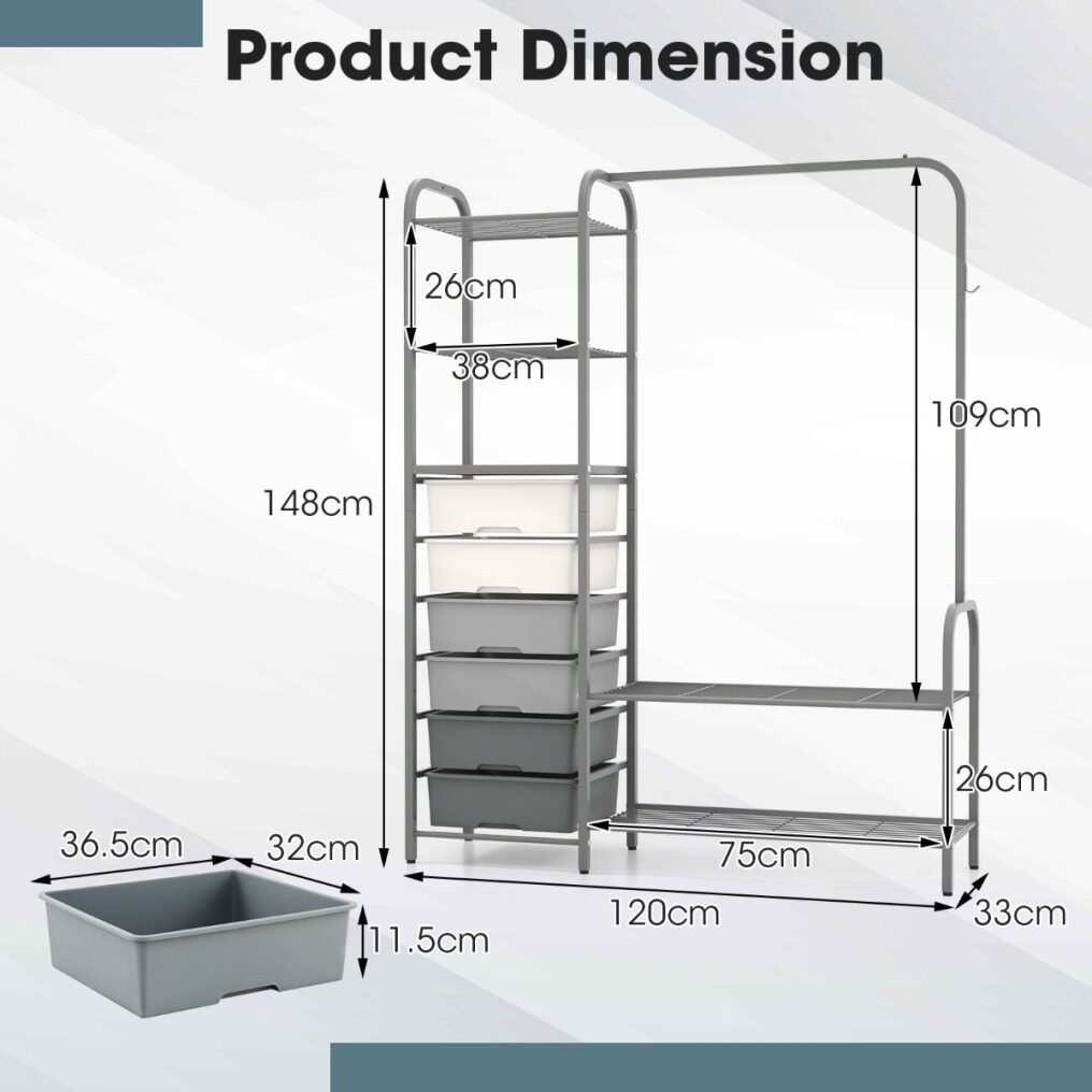 ● Classified Storage Solution: This heavy-duty garment rack includes 6 pull-out drawers, 3-tier open shelf, 2-tier shoe rack, 1 wide hanging rod and side hook. Thus, it offers plentiful storage space for various kinds of clothing, such as clothes, shoes, bags, storage boxes and other items.