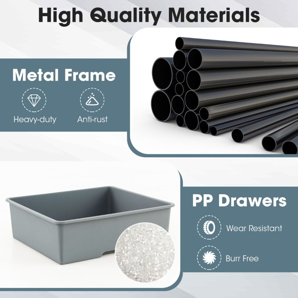 ● Durable and Sturdy Construction: Made of high quality materials, this freestanding closet organizer will serve for many years. The heavy-duty and anti-rust metal frame promises overall steadiness. Moreover, the PP drawers with wear resistant and burr free surface withstand the test of time.