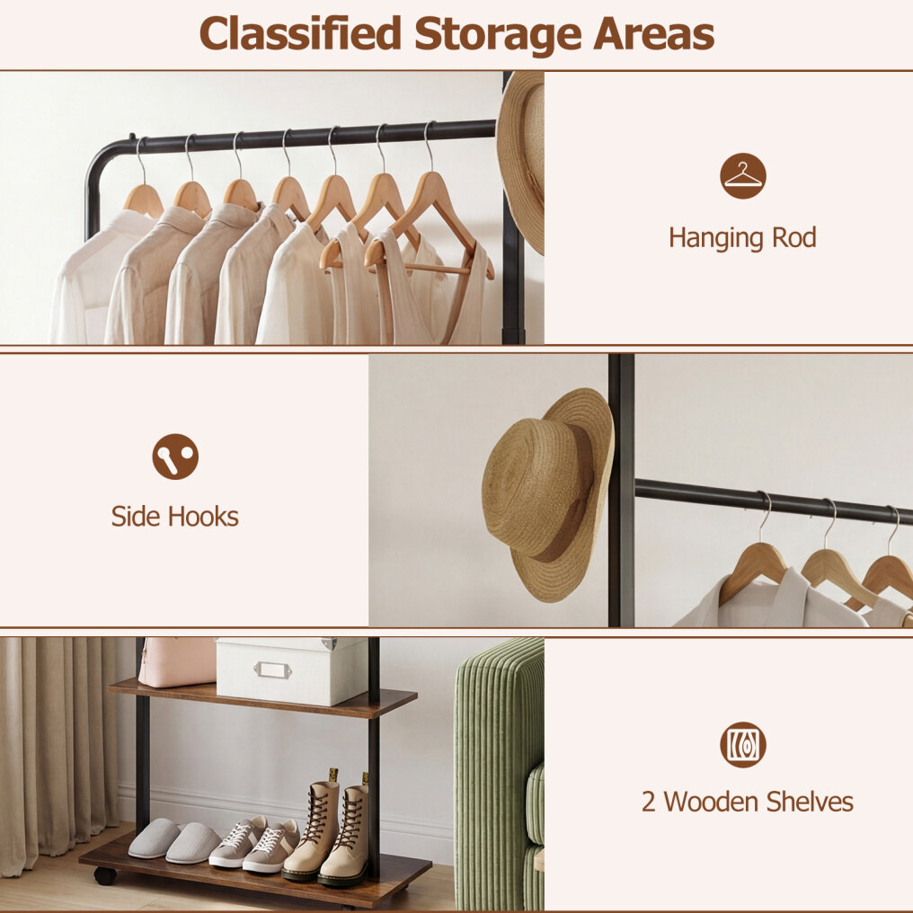 ● Organized Storage Solution: This freestanding clothing rack offers a sturdy hanging rod for your outfits, 2 side hooks for accessories, and 2 wooden shelves for folded items. Thanks to these classified storage areas, everything from jackets to shoes can fit perfectly for a neat space.