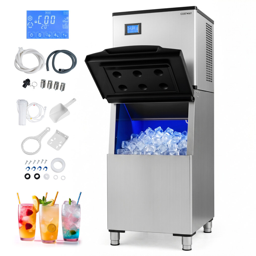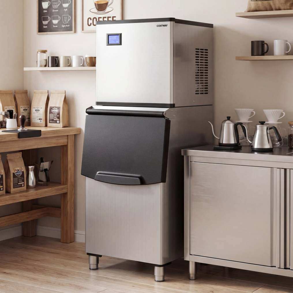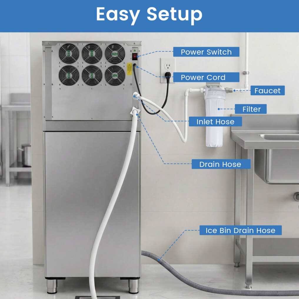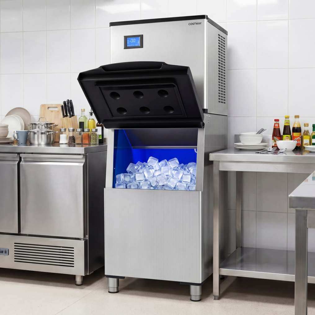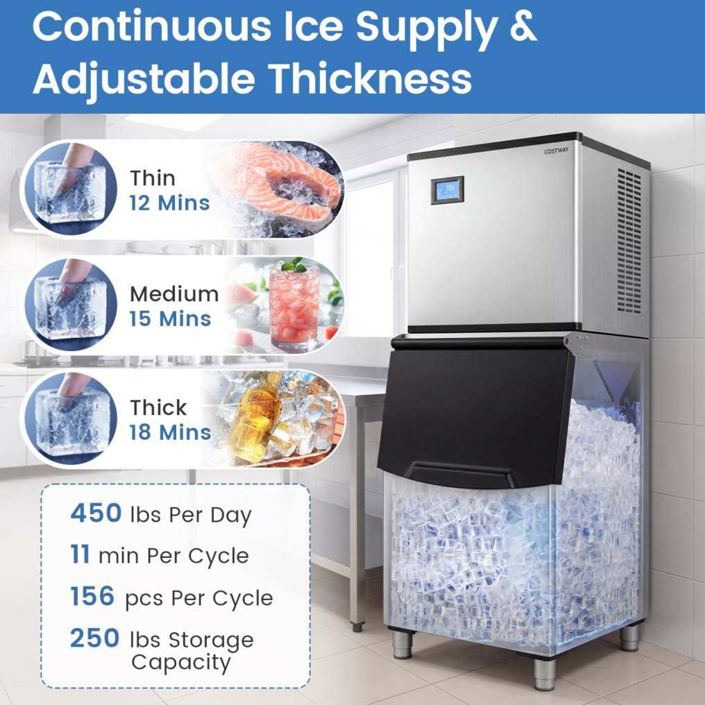 ● High Volume Ice Supply: This ice machine produces up to 450 lbs of ice daily, supporting continuous operation in busy restaurants or bars, and provides a full batch of 156 pcs clear ice cubes in about 11 minutes with consistent performance.