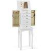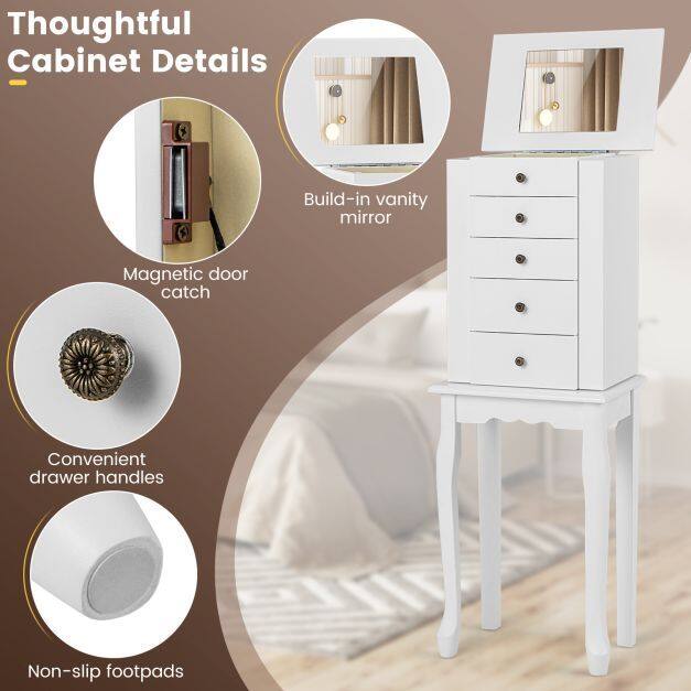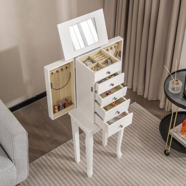 Hinged Mirror & Top 4 Compartments : The standing jewelry cabinet is equipped with a hinged mirror that allows you to put on earrings, necklaces and check your appearance. The compartments divided under the top lid are perfect for storing small pieces of jewelry.