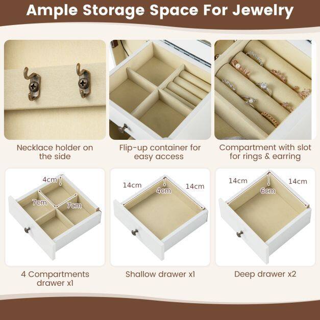 Spacious Storage Space : The jewelry cabinet has 4 drawers (1 4-compartment drawer, 1 shallow drawer, 2 deep drawers) to categorize your belongings. In addition, 2 side swing doors with 8 necklace hooks and 2 storage shelves provide enough space for displaying necklaces, cosmetics, perfumes, etc.