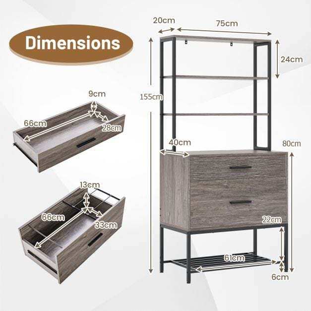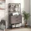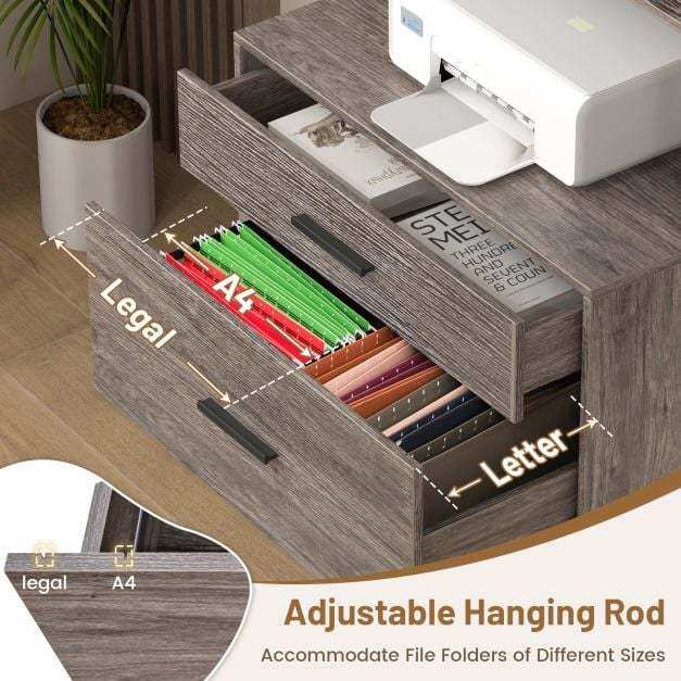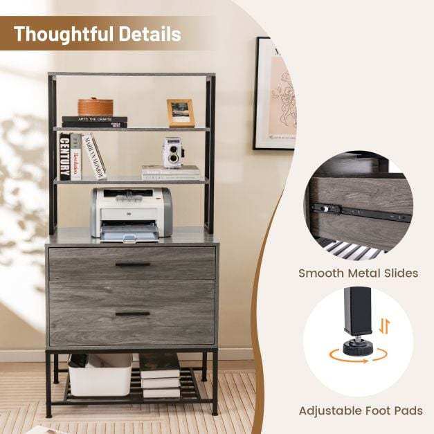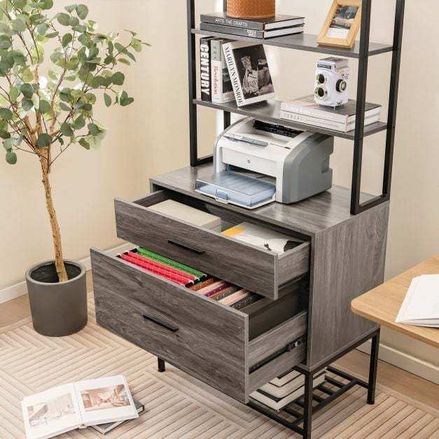 Ample Storage Space: This file cabinet features a 3-tier bookshelf, a printer countertop, 2 storage drawers, and a bottom shelf, providing various storage options. It can keep your work supplies neatly organized and within easy reach.