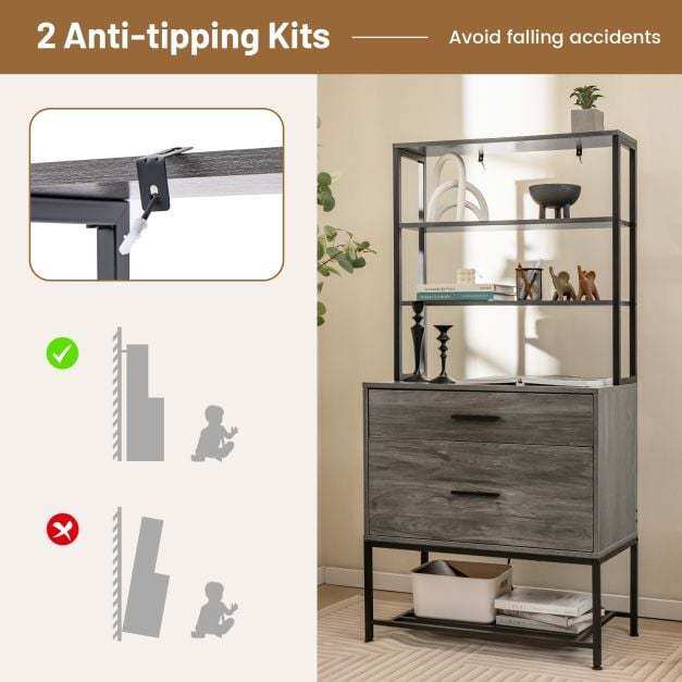 Say goodbye to clutter and hello to convenience with 3 open shelves, printer countertop, 2 spacious drawers, and bottom shelf. With ample space to neatly arrange yours files, books, printers and ornaments, you’ll never waste time searching for essentials again. The large file drawer can accommodate file folders of different sizes, keeping your important documents organized and easily accessible. Designed for stability, our cabinet comes with 2 anti-tipping kits and adjustable foot pads on sturdy metal legs. Transform your workspace and enjoy a stress-free, efficient work environment - order now!