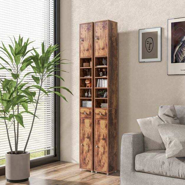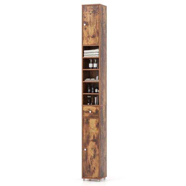 This tall bathroom cabinet is a great storage solution for small spaces! This cabinet features a small footprint but large storage capacity with 2 cabinets, 5 compartments and 1 drawer, making it perfect for small spaces or corners in your home to create extra storage space. In addition, there are 5 adjustable shelves that provide you with customizable storage space to meet different storage needs. This bathroom cabinet is made of high-quality MDF material and features a durable and stable structure. And users can mount this tall cabinet on the wall with the included anti-tip device, which is safer for families with children and pets.