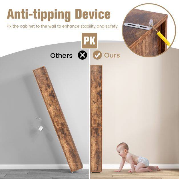 Anti-tip device and high-quality hardware: The anti-tip device allows users to attach this tall cabinet to the wall for additional safety and stability. The cabinets and drawers feature round doorknobs and are equipped with magnetic closures.