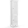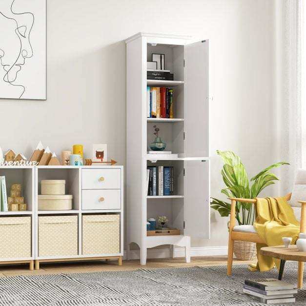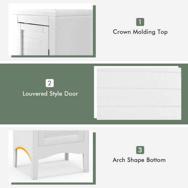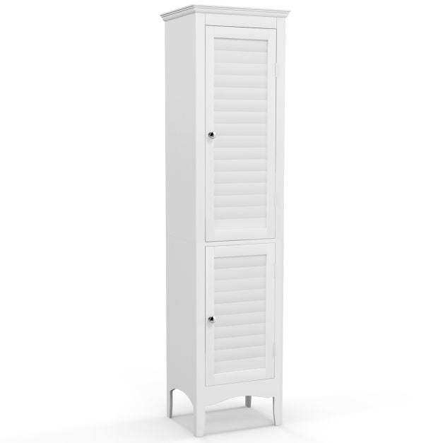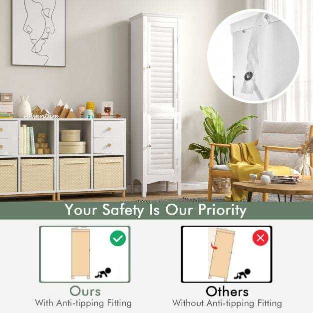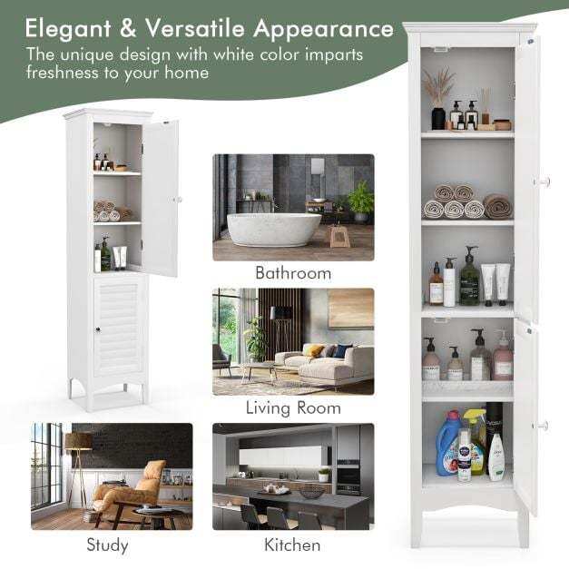 Clean up your bathroom with our tall narrow bathroom cabinet! Made of selected MDF with a painted surface, the slim bathroom storage cabinet shows great durability and stability. The 2 doors and 5 storage shelves render items inside clean and tidy. By altering the position of the adjustable shelf behind the lower door, you can stow objects of various heights. In addition, the provided anti-toppling device avoids accidental falling and creates a safe environment. The louvered style doors, plus the crown molding top and arch shape bottom, add a fresh touch to your home. Furthermore, the narrow floor storage cabinet takes little floor space while offering a rich storage area. It is a perfect complement to your bathroom, living room, bedroom, etc.