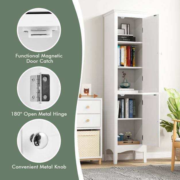 Premium Material and Details: Made of high-quality MDF, the tall narrow storage cabinet promises a longer service time. Moreover, the chrome-finished knobs, along with the magnetic door catch and the 180° open metal hinge, allow you to push or pull the doors easily.