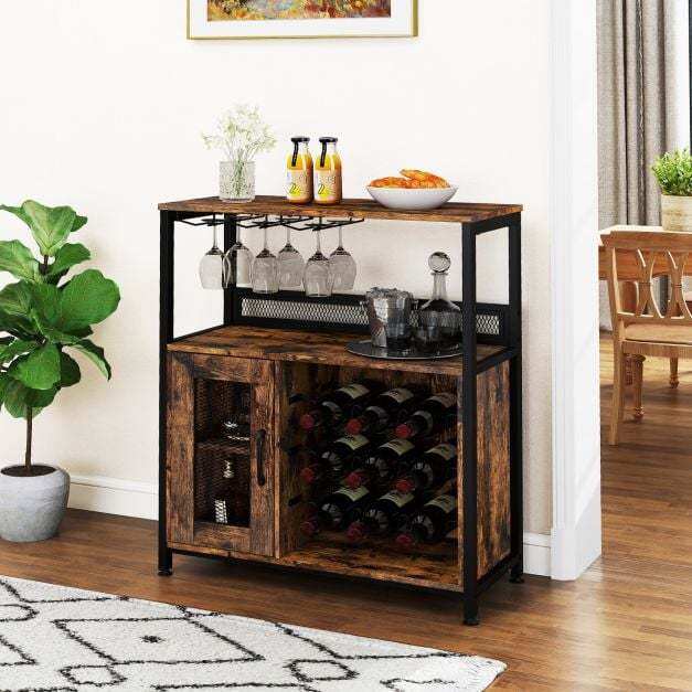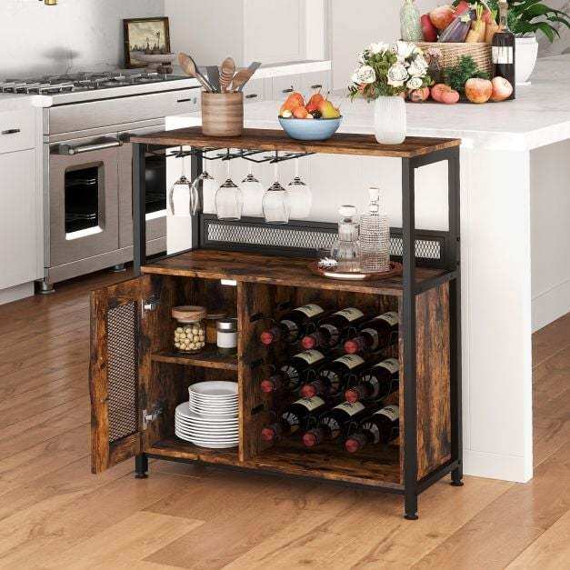 Industrial charm: The wine rack's mesh door provides breathable storage and gives the cabinet a striking industrial look. Stylish metal handles complete the design, combining rustic charm with an elegant look that enhances your space.
