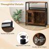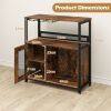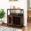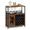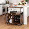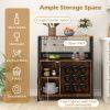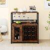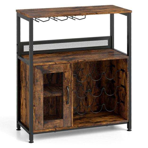 Generous storage space: With a large work surface, one open shelf, and a two-tier cabinet with a door, the bar cabinet offers ample space for wine accessories and other essentials. The interior shelf is removable, allowing for the storage of larger bottles or appliances.