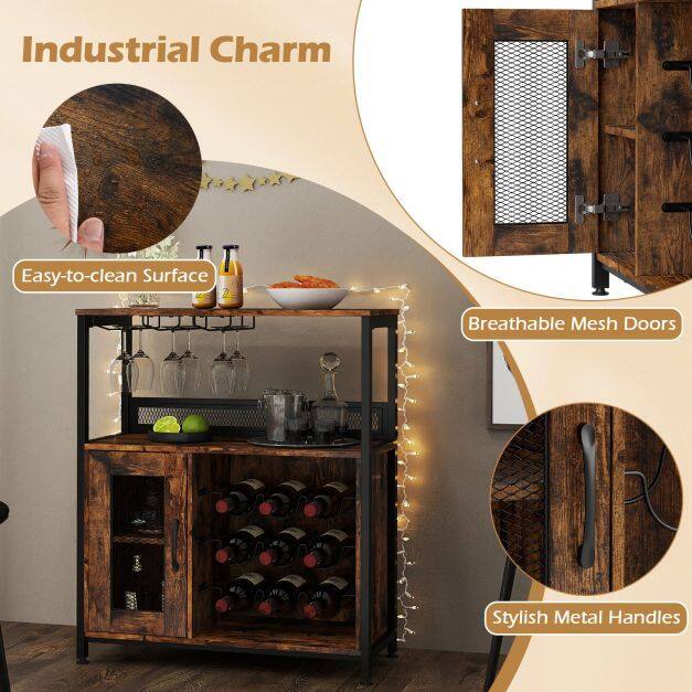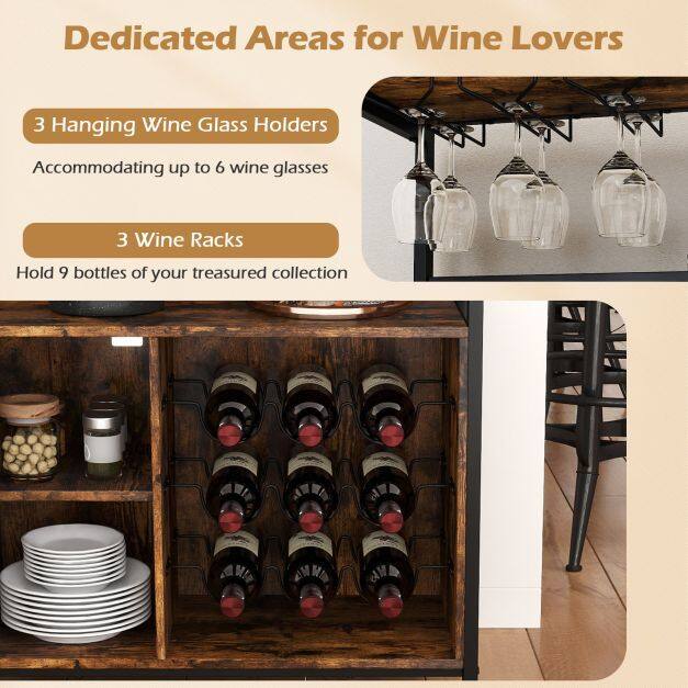 Designed for wine lovers, this wine bar cabinet offers dedicated storage for 9 bottles and 6 glasses, as well as a generous countertop, open shelves, and a 2-tier cabinet for bar accessories or display purposes. The removable wine rack allows for storage of larger items, while adjustable feet and safety bars ensure stability and protection for your collection. With a sturdy frame, metal hinges, and a breathable mesh door, this bar cabinet combines robust durability with stylish elegance. Thanks to its compact dimensions, it's versatile as a wine cabinet, sideboard, or storage cabinet—perfect for any place where a good drink awaits!