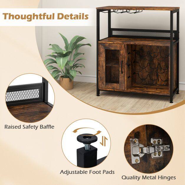 Thoughtful details: The freestanding wine bar cabinet features adjustable foot pads for stability on uneven floors, as well as raised safety bars on the open shelf to protect your wine collection. The sturdy frame and high-quality metal hinges ensure a long service life.