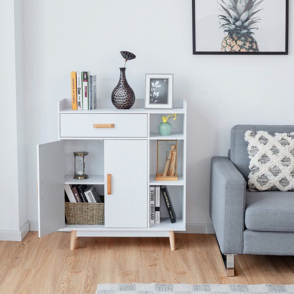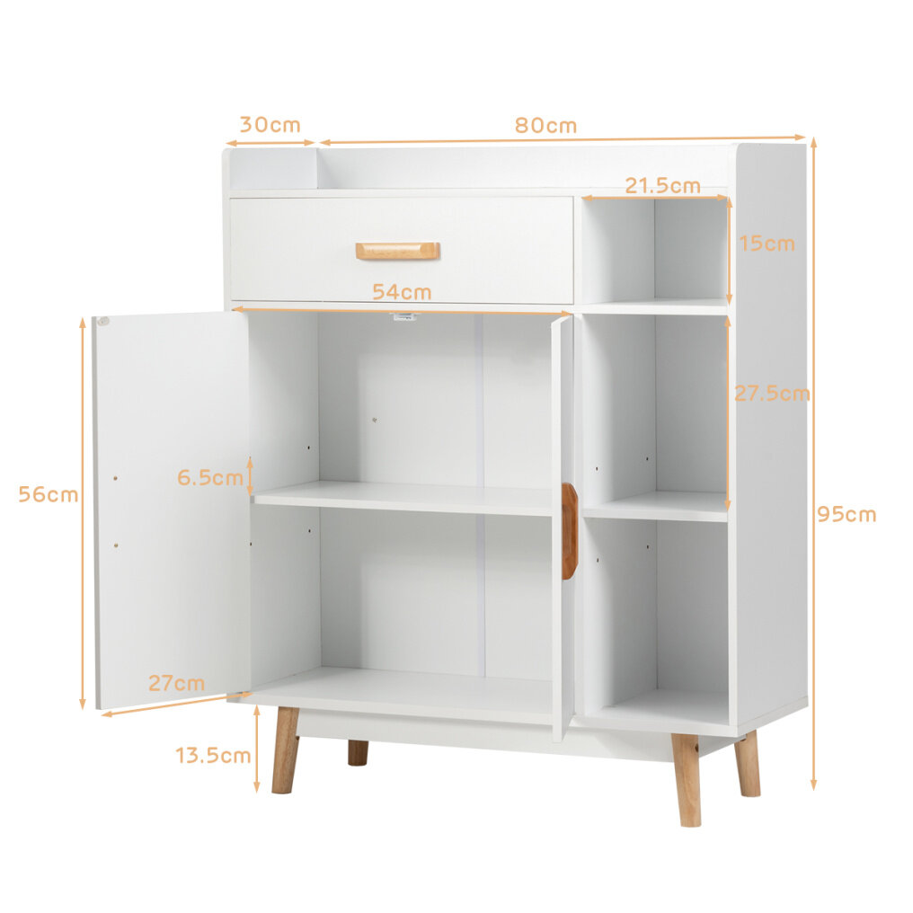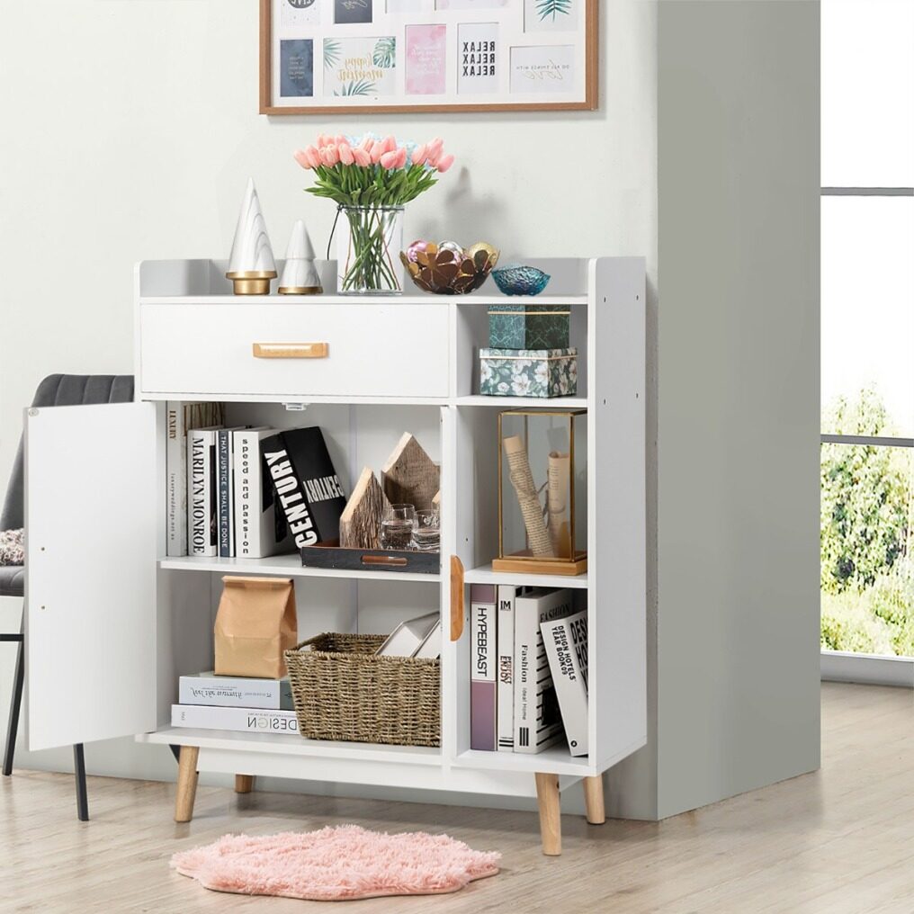 Versatile Storage Space: The storage cabinet offers you enough storage space with a large tabletop, a drawer, 3 compartments and a 2-door cabinet. To the left, right and back of the surface, there is a table bezel that prevents your items from falling down.