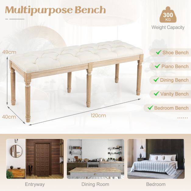 ● Versatile Style and Wide Use: With its classic button tufting and exquisite carving, this upholstered bench can seamlessly blend into any decor style. Whether in your living room, bedroom, dining room, entryway or more, it will enhance the aesthetic appeal of your space.