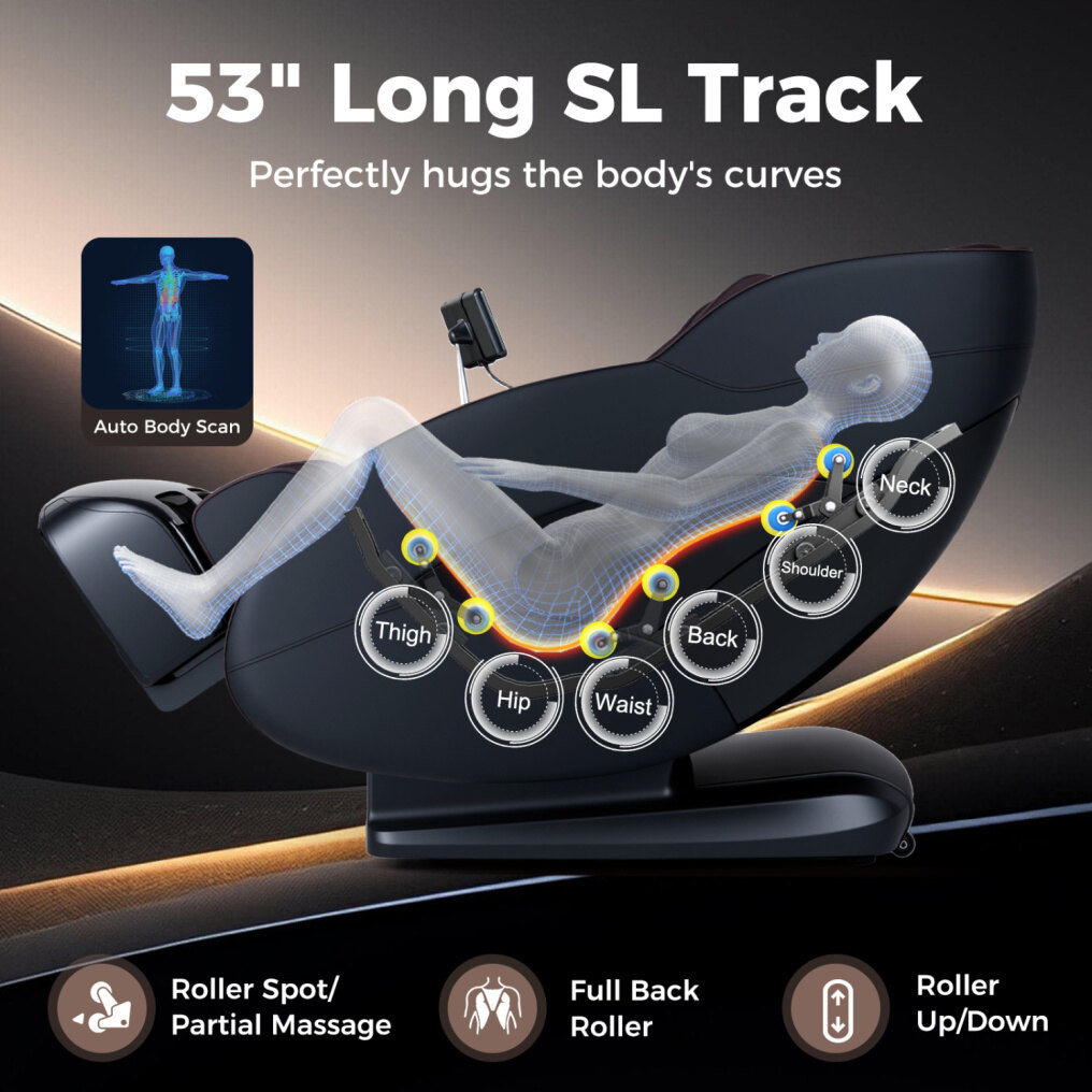 ● Smart Body Mapping: This 3D massage chair is equipped with a 135 cm/53" long SL track that perfectly hugs the body's curves for more consistent contact. The roller spot/partial massage/full back roller massage offer customized comfort, complete with easy roller up/down adjustments. Besides, the auto body scan function can detect your unique shape before each session.