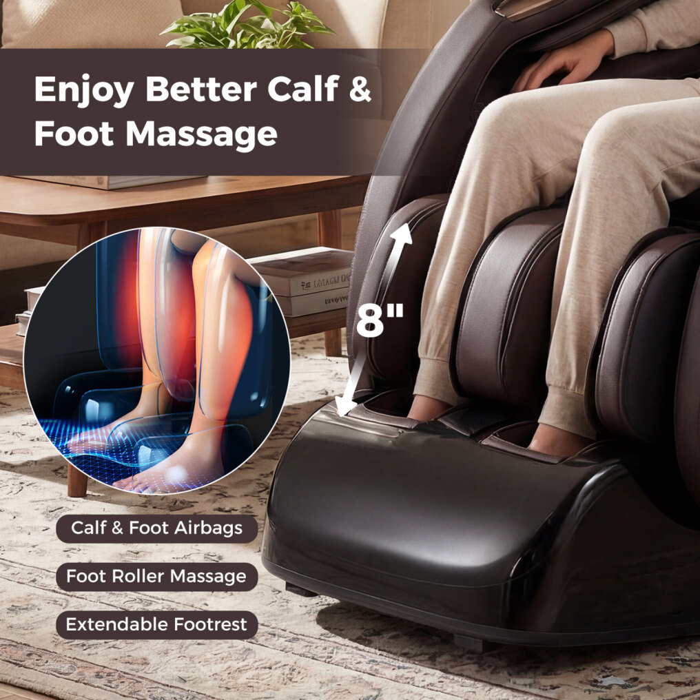 ● Heating Function & Foot Care: This massage chair brings together waist and calf heat therapy to loosen tension in areas that often hold the most strain. Foot roller massage adds a refreshing finishing touch underfoot, and the 18 cm/7" extendable footrest allows the chair to adapt to different heights for a better full-body fit.