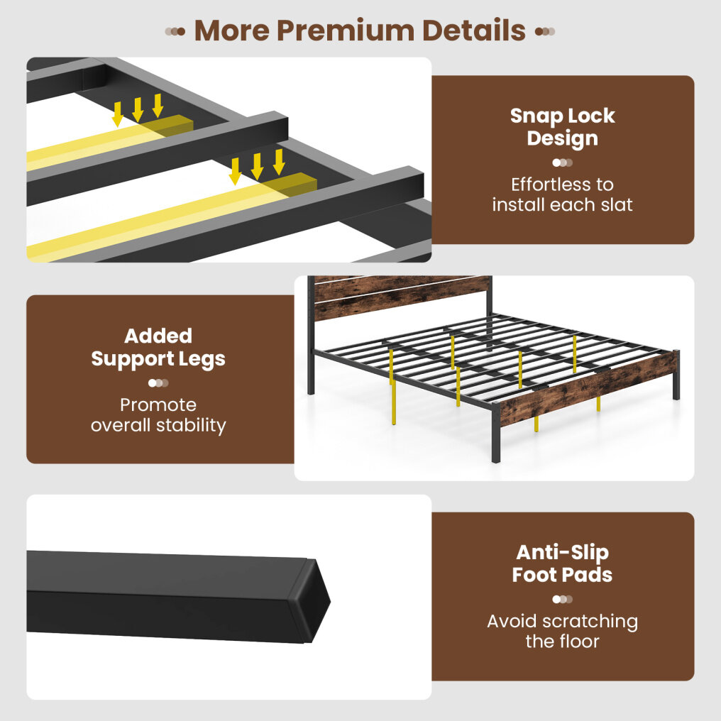 ● More Premium Details: Elevate your setup with the bed frame's intuitive snap lock slats for quick assembly. Moreover, the platform bed includes anti-slip foot pads to ensure a secure foundation that is friendly to your floor.