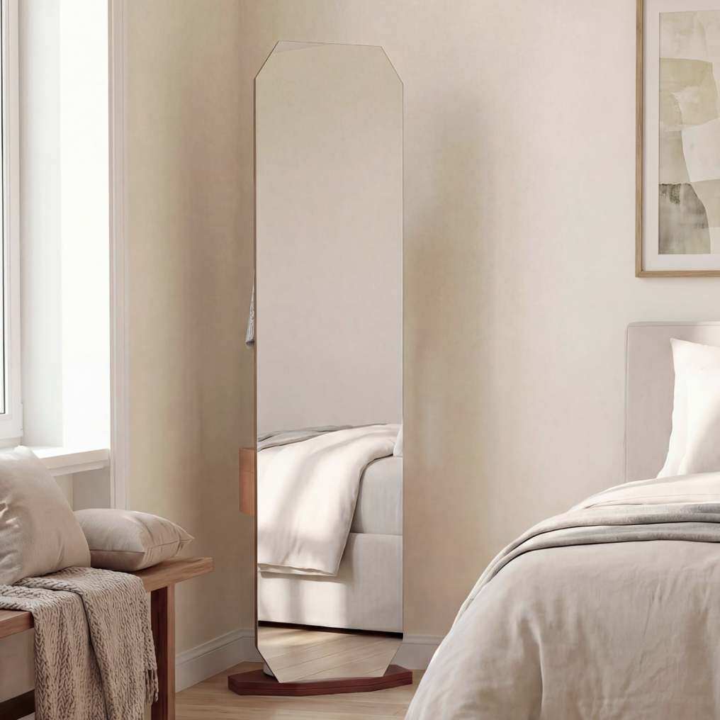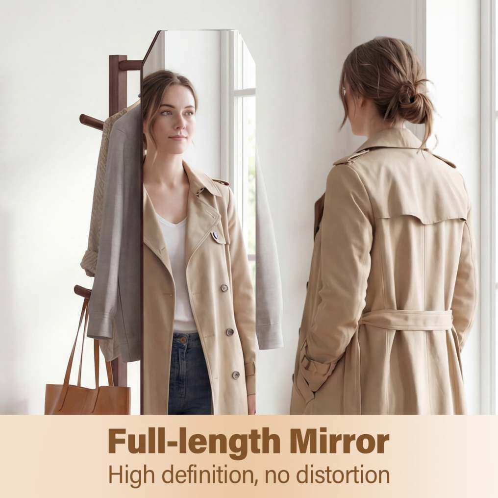【3-in-1 Design】Combining a full-length mirror, a coat rack, and a storage shelf in one piece of furniture, this freestanding mirror simultaneously meets multiple needs, such as looking at oneself, hanging clothes, and storing items.