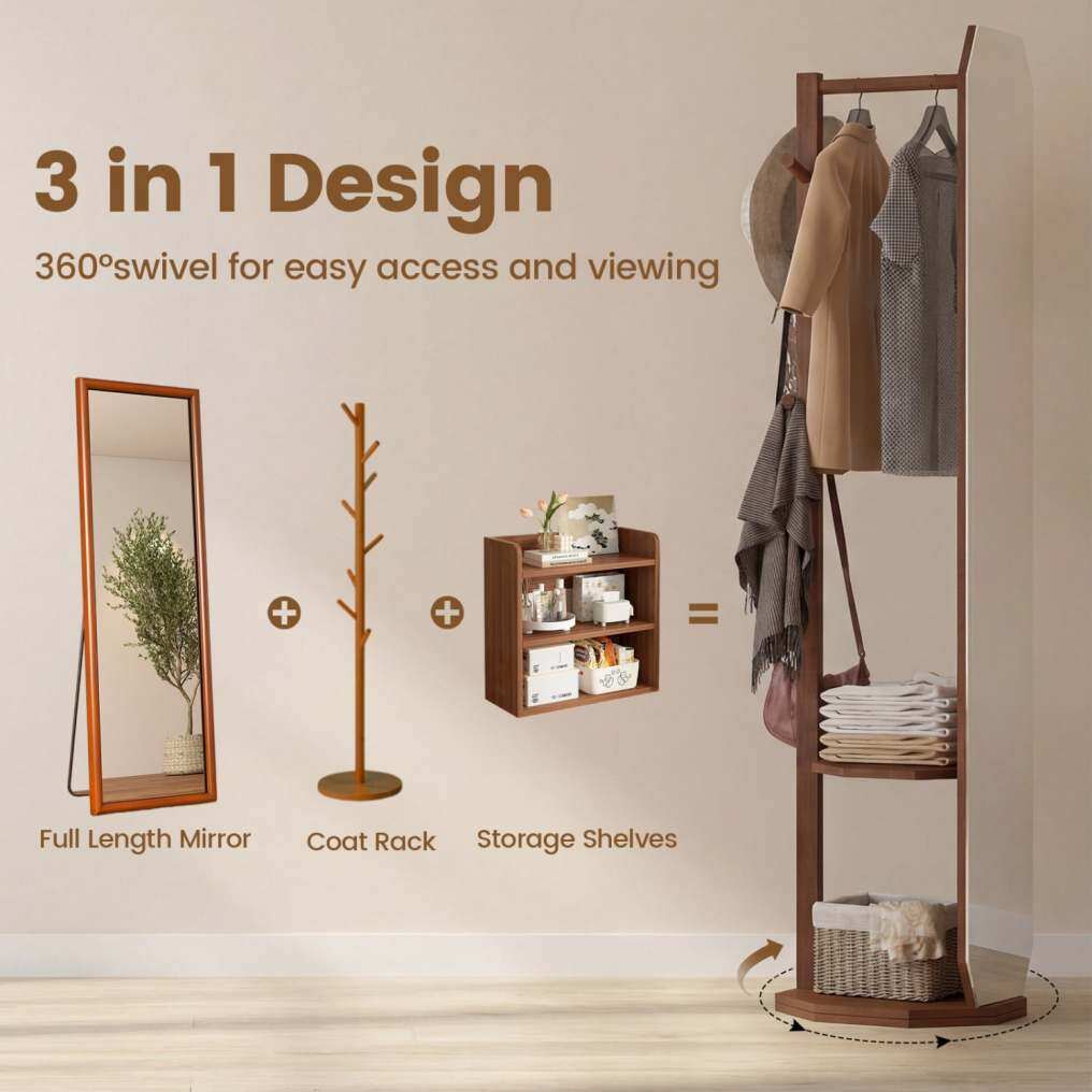 Discover this 3-in-1 freestanding mirror that combines practicality and elegance to enhance your interior. This clever piece of furniture combines a full-length, high-definition mirror, a coat rack with multiple rods and hooks, and two spacious shelves for organizing clothes, bags, hats, and accessories. Furthermore, the 360° swivel base allows you to easily adjust the mirror's angle for comfortable use. This mirror with a coat rack blends seamlessly into any room, from the living room to the bedroom, thanks to its natural and minimalist style.