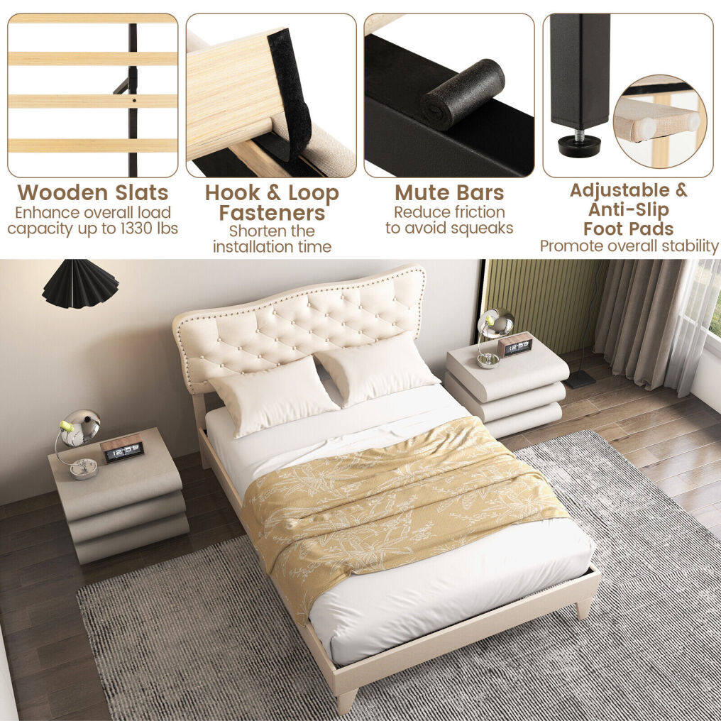 ● Easy Setup and Delicate Design: The platform bed boasts a clear manual for simple installation. After assembly, you'll be amazed by the elegant headboard that includes smooth curves & unique nail trim to fill your bedroom with charm.