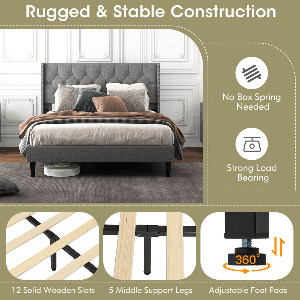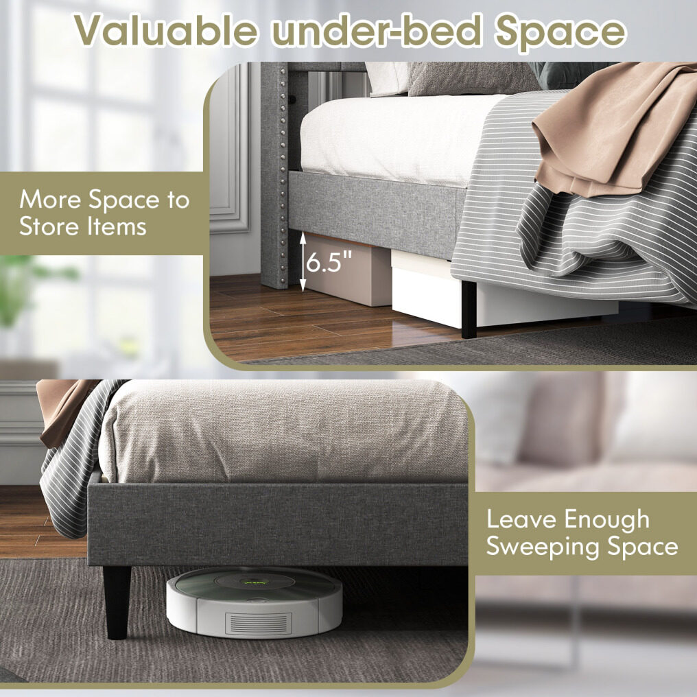 ● Rugged and Stable Construction: The heavy-duty connection framework, 12 solid wooden slats, and 5 middle support legs play an important role in the strong load bearing and durability of the bed frame. The upholstered platform bed easily supports weights up to 880 lbs.