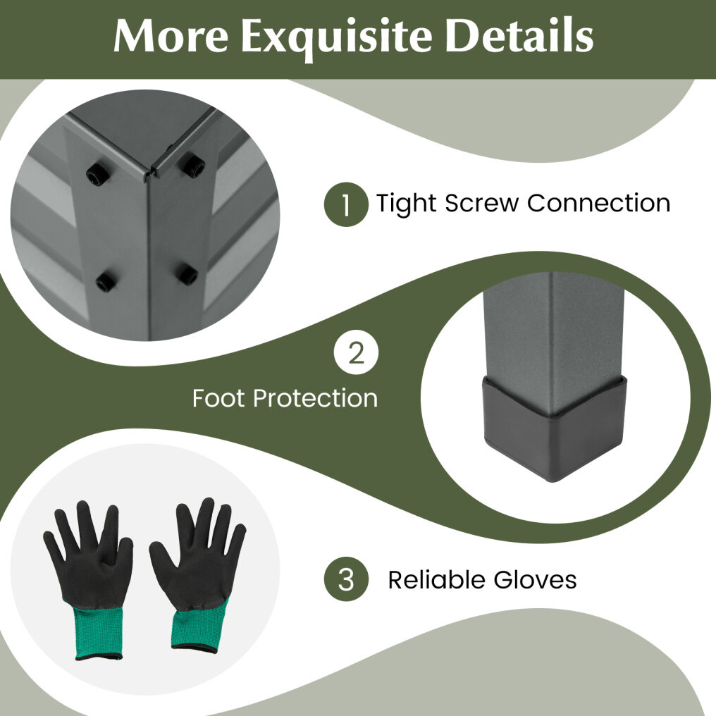 ● Solid Construction and Gloves Included: With reinforced structure and foot protection, this planter box offers strength and stability. Besides, it comes with reliable gloves to offer extra protection when you work in the garden.