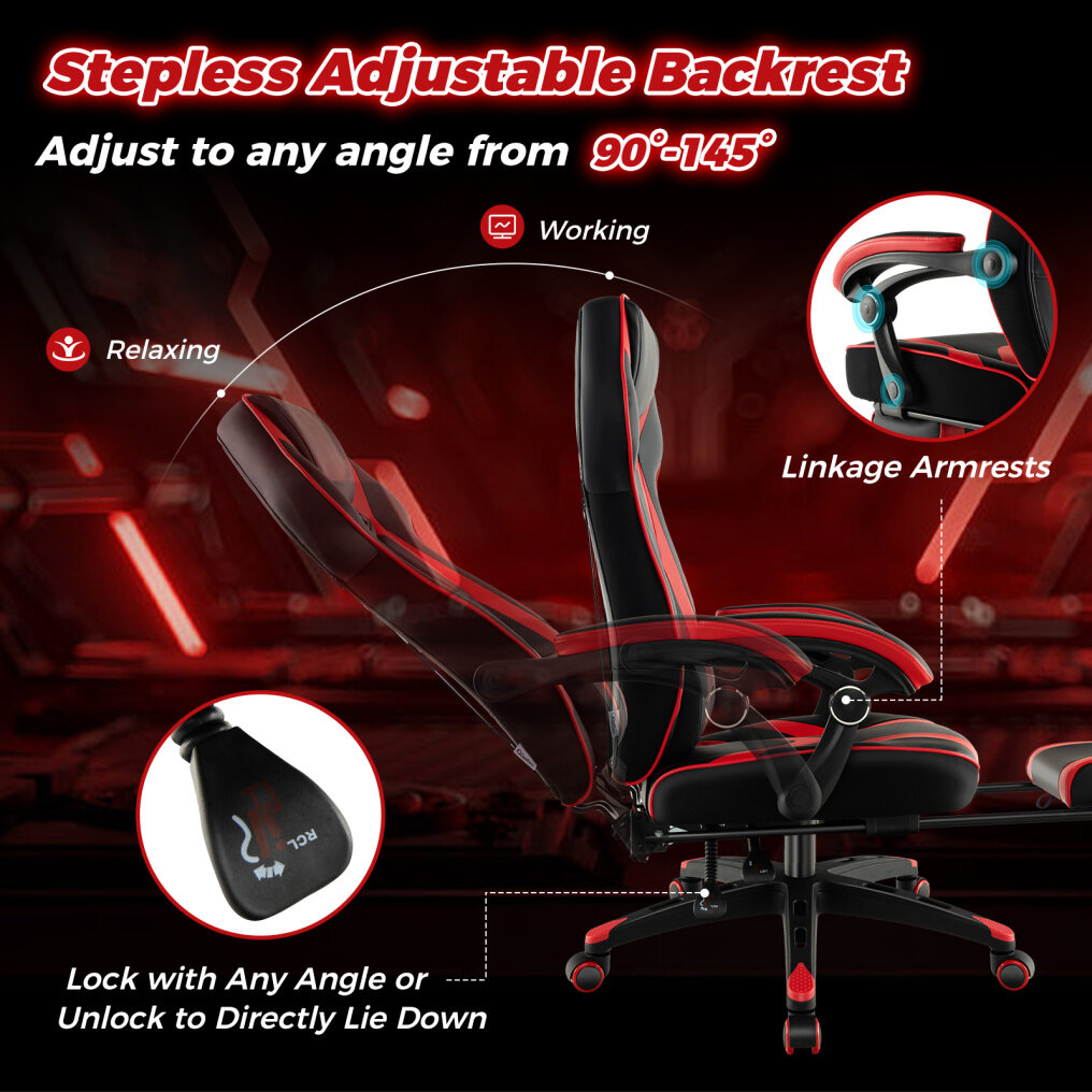 ● Reclining Chair with Footrest: With the 90°-145° tiltable backrest and retractable footrest, you can have a quick power nap or relax after an intense gaming session. In addition, the linkage armrests of this gaming chair are equipped with soft padding to offer ultimate support for your elbows.