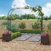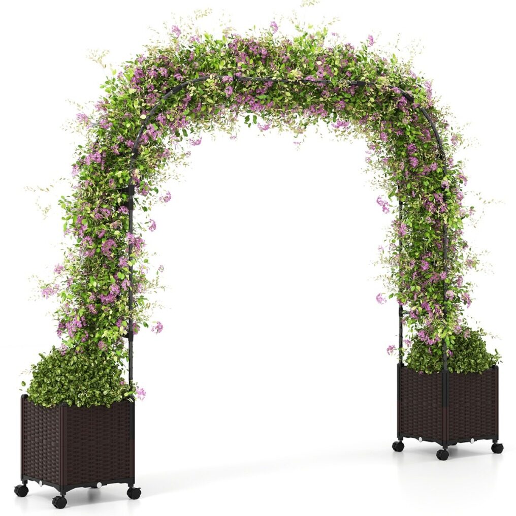 The versatile outdoor arch features an extended arch for decorations, two side rails for climbing plants, and two planters for vegetables, seedlings, or flowers. The metal tubes are coated with a protective PE coating for heat and rust resistance, ensuring your trellis will stay in mint condition for years to come. The planters feature a self-watering system to ensure optimal moisture supply for the plants. Drainage holes also prevent overwatering. Thanks to eight lockable wheels, you can easily move your botanical retreat to the best spot in your garden.