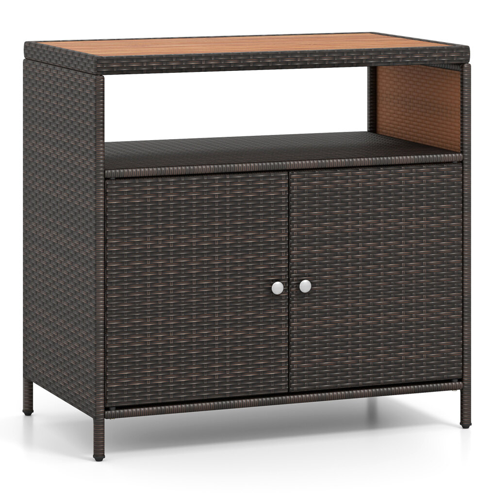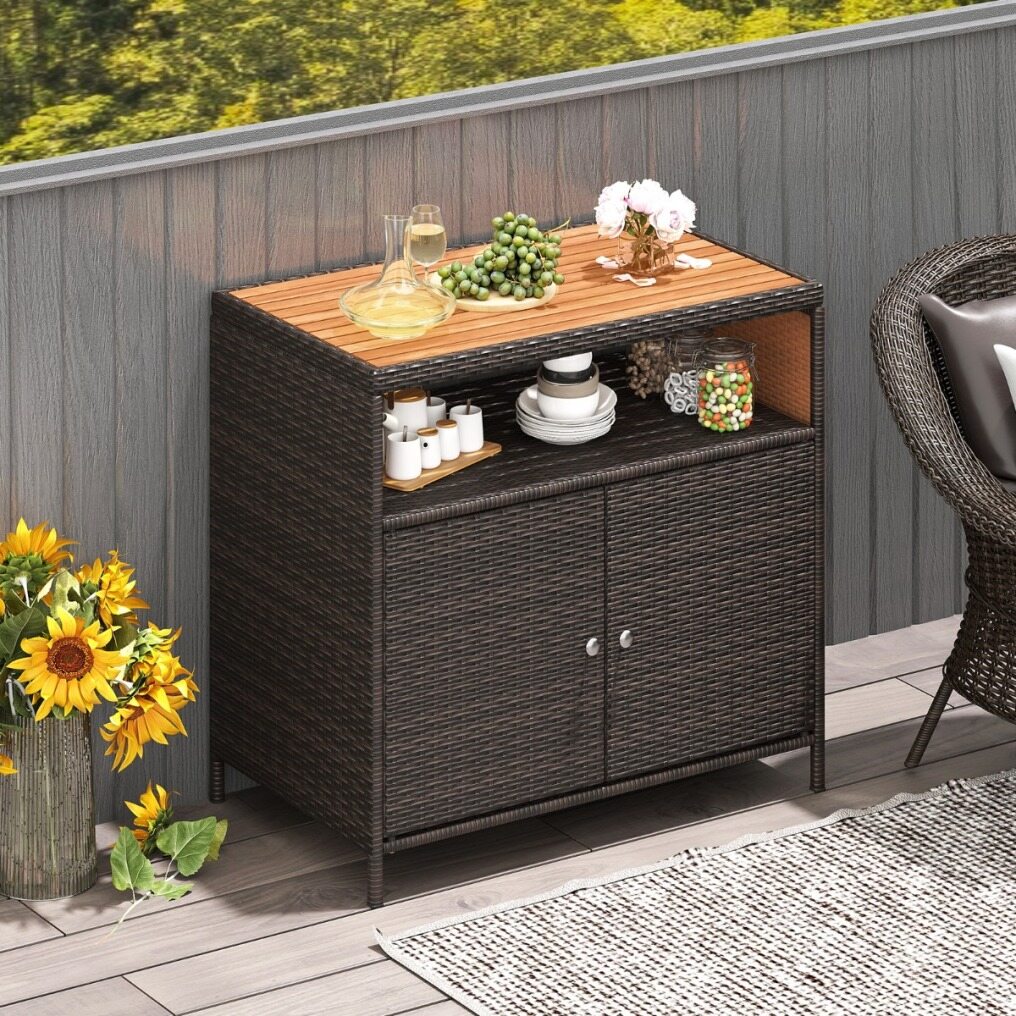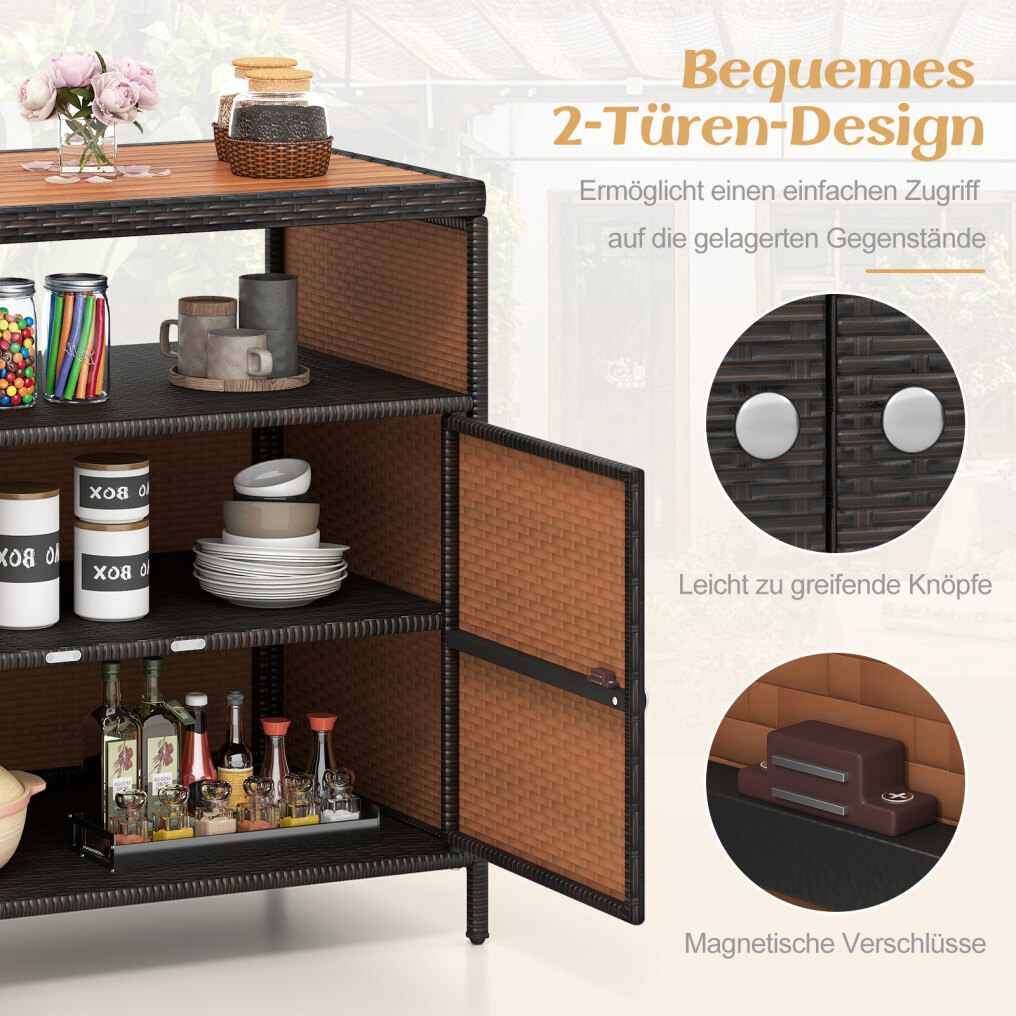 Experience ultimate outdoor organization with this rattan storage cabinet. Featuring a spacious top shelf, an open compartment, and a two-door closed section, this rattan sideboard is both stylish and practical. Constructed on a wobble-free and warp-resistant metal frame with adjustable feet, it can support up to 90 kg. The sun-resistant rattan design ensures longevity, while the natural acacia wood top adds charm and easy maintenance. Both high-quality materials are durable and user-friendly. This versatile cabinet is perfect for patios, decks, gardens, or pool areas. Remember to protect this perfect outdoor furniture from rain to extend its lifespan and keep your outdoor space organized and elegant.
