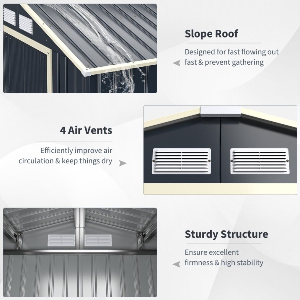Multiple Thoughtful Design: Cool air circulates through the front and rear vents keeping the belongings well protected. Designed with sloped groove, the outdoor storage shed can effectively avoid water accumulation and allow the rain to flow down quickly, making it ideal for various outdoor occasions.