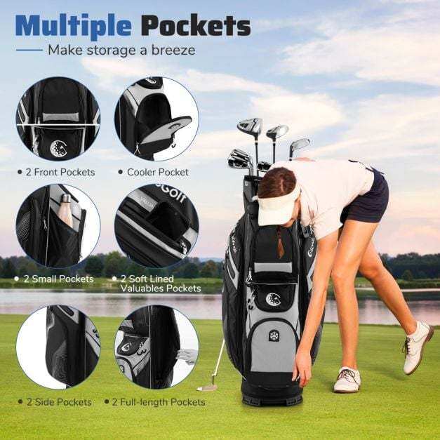 Designed with a 14-way molded lock top with full-length dividers, this golf bag offers excellent organization and separation of your clubs, ensuring they are securely held and easy to access. It features a total of 11 pockets, providing ample space for all your essential accessories. These include 2 lined valuables pockets to keep personal items safe and a cooler bag to keep your beverages chilled throughout the day. Crafted to cater to every golfer's needs, this golf club bag is lightweight and comes with a padded strap and multiple handles, making it effortless to carry around the golf course. Additionally, the golf bag includes a towel ring, glove holder, pen pouch, rain hood and umbrella holder for convenient use.